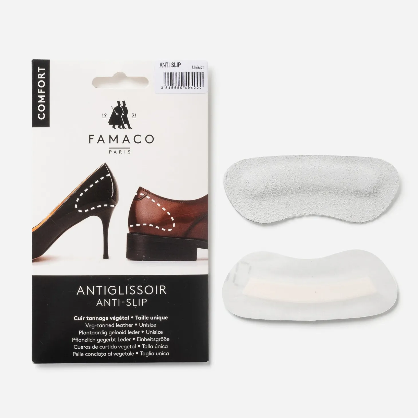 Stop au talon qui glisse hors de la chaussure ! La solution : des antiglissoirs auto-adhésifs en cuir velours gris clair au tannage végétal. Appliquez-les, très facilement, à l’intérieur du contrefort après avoir ôté le film protecteur.