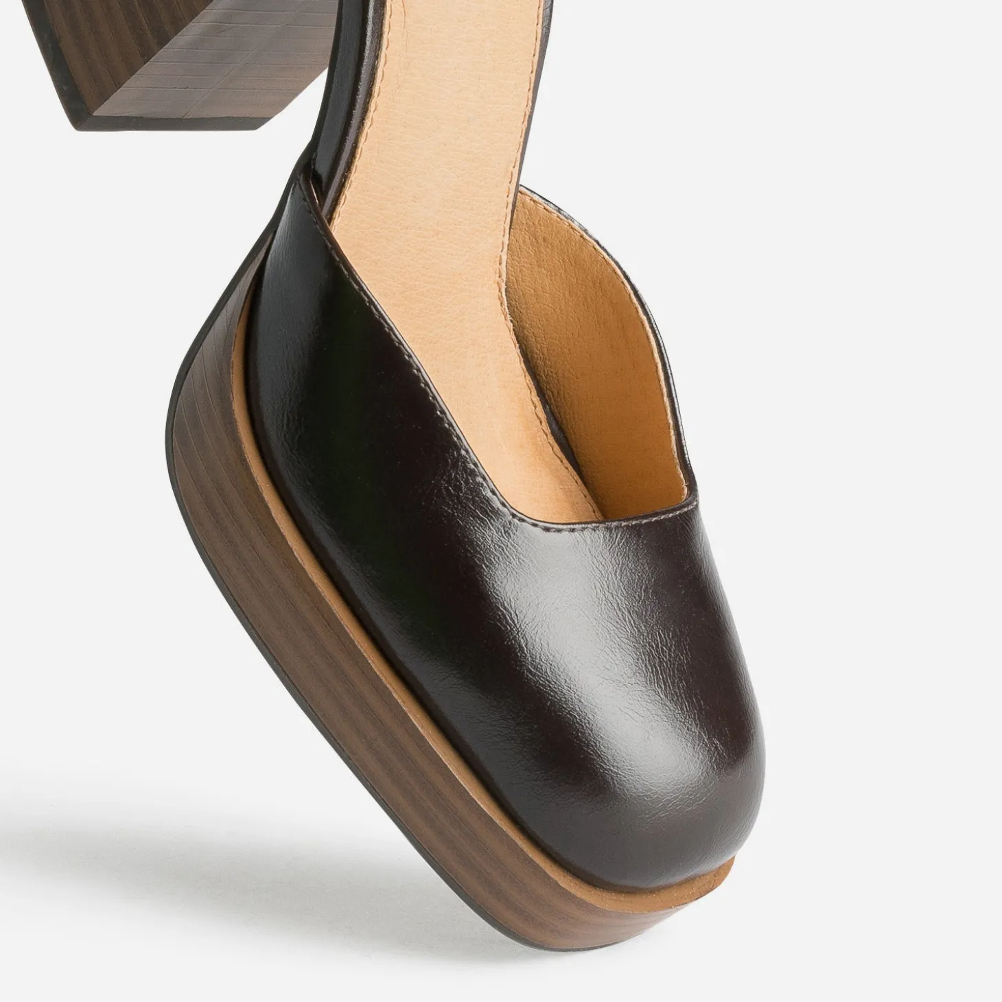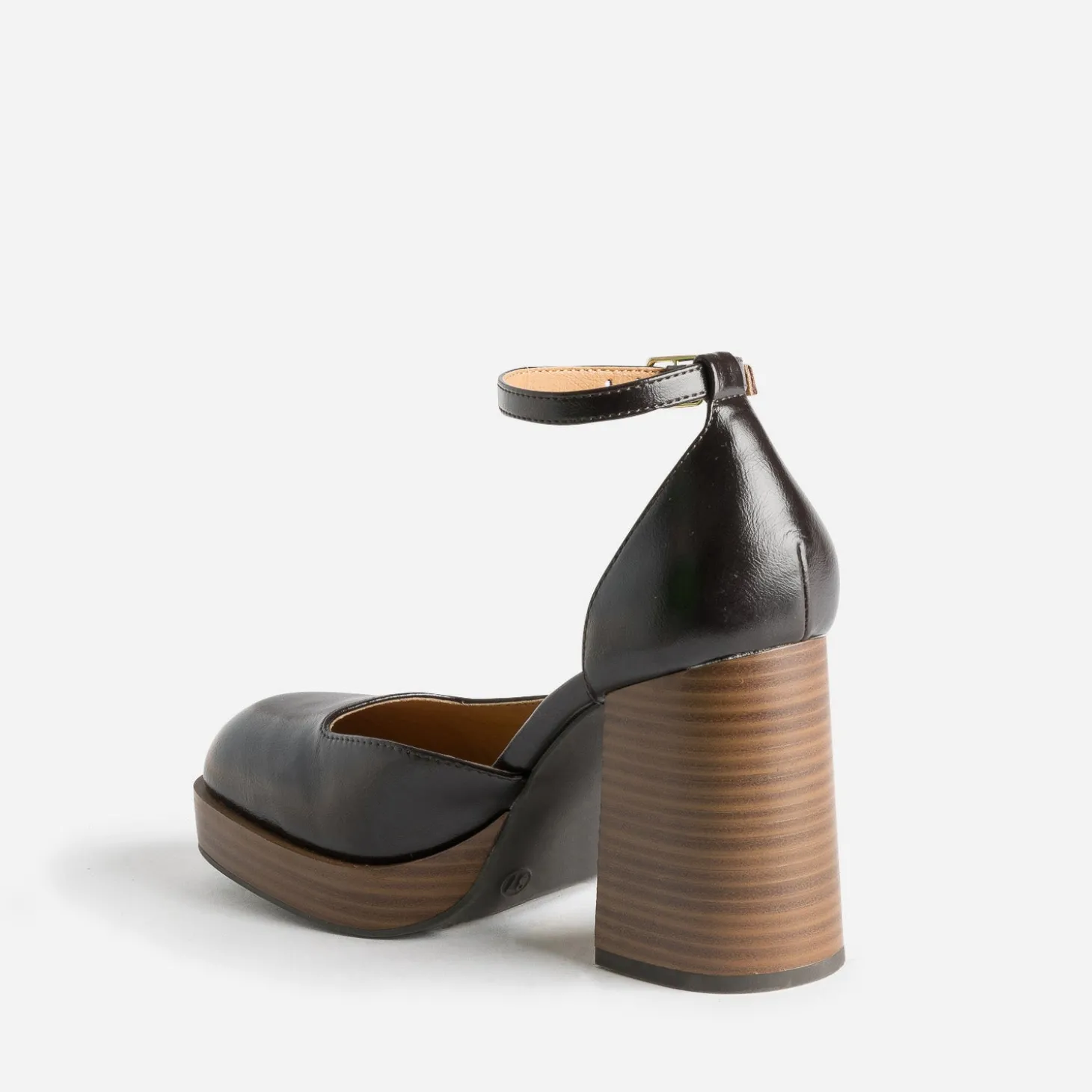 Coup de cœur pour cette babies, à la fois rétro et moderne. Rétro par son talon massif forme flare de 9 cm, soulagé par un patin avant de 2 cm. Moderne par son coloris chocolat, sur matière synthétique à finition glacée, et son décolleté carré. Imaginez-la avec une robe longue à fleurs dans les tons orangés ou avec un blouse lavallière et une jupe midi dans les teintes kaki.