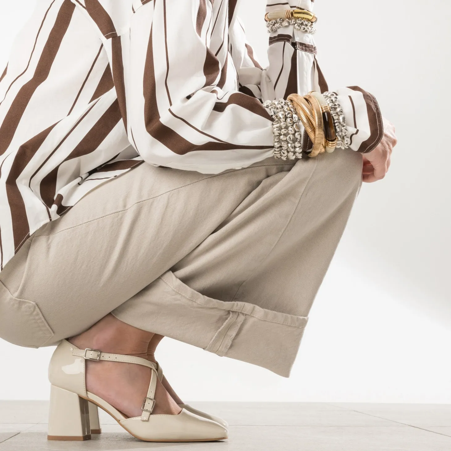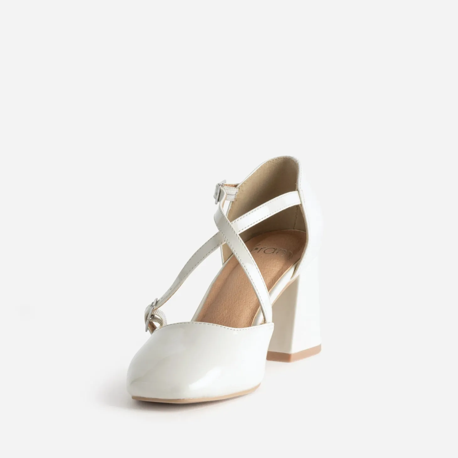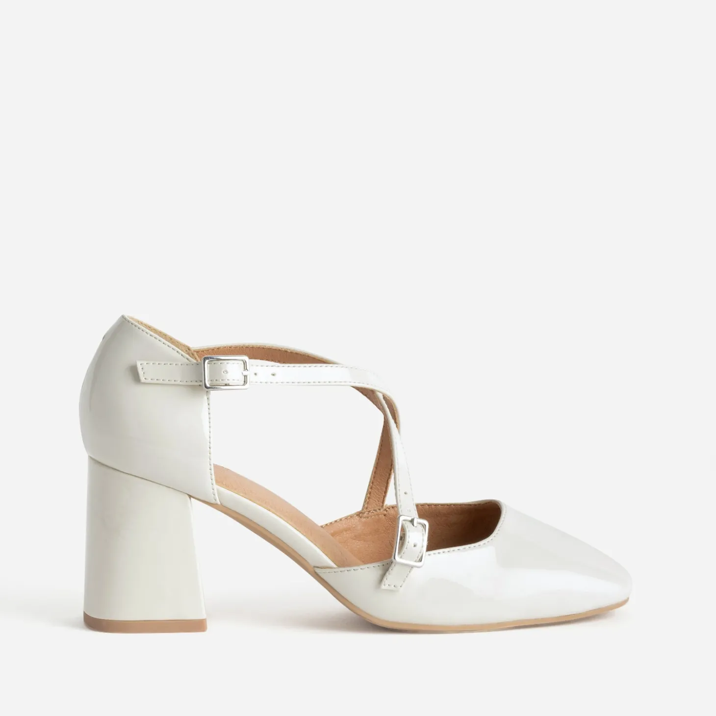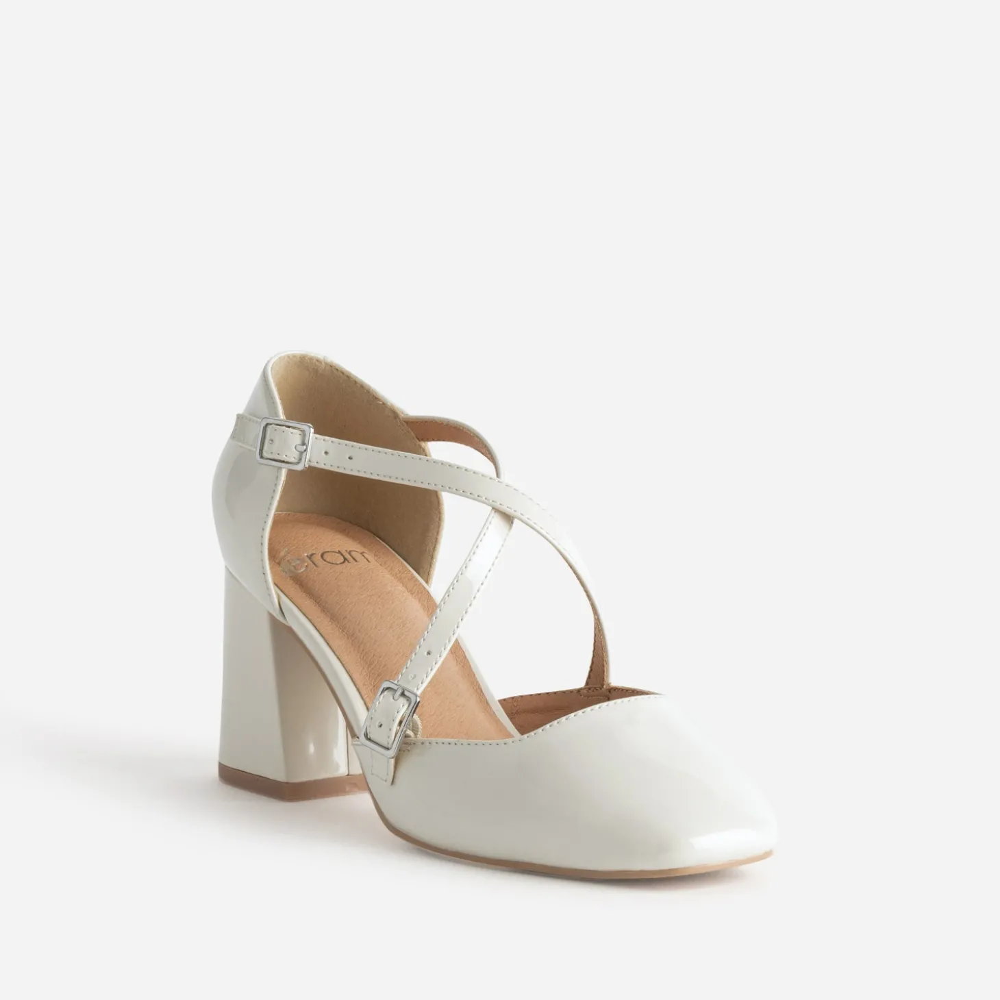 La tendance est au soulier féminin, un brin rétro. Une illustration parfaite avec cette babies pour femme. En matière synthétique lisse, elle se décline en coloris beige clair et finition vernie jusqu’à la pointe de son talon, et deux fines brides enveloppent le pied avec subtilité. Un modèle à décaler avec des socquettes blanches en dentelle.