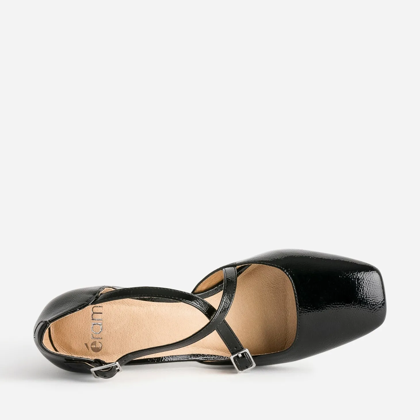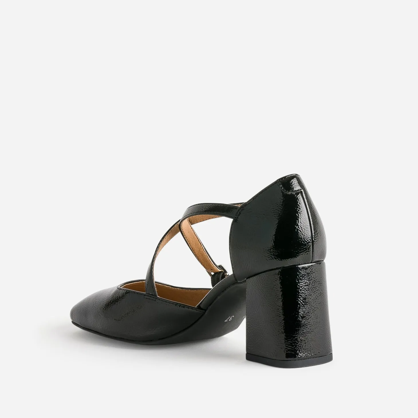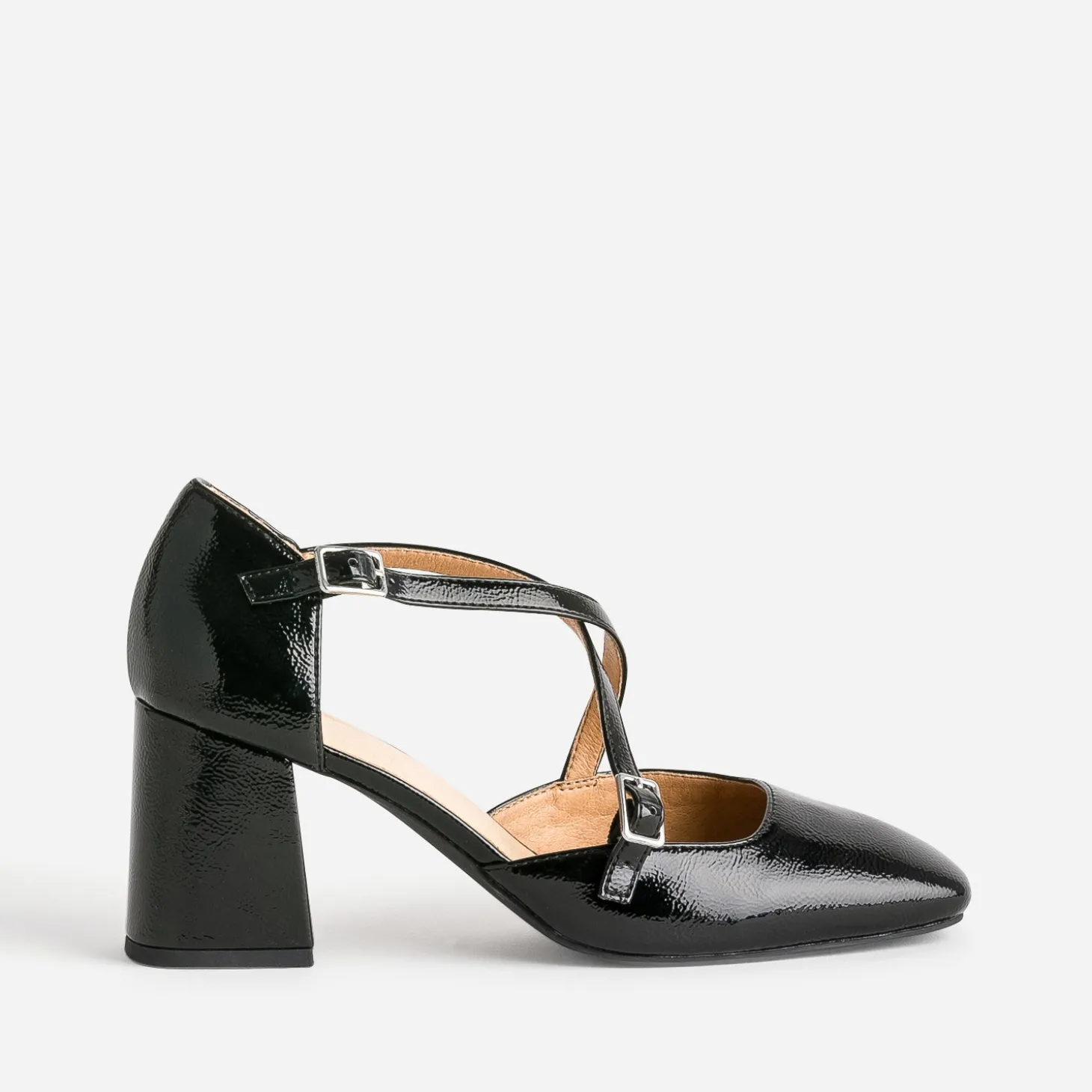 La tendance est au soulier féminin, un brin rétro. Une illustration parfaite avec cette babies pour femme. En matière synthétique lisse, elle se décline en coloris noir et finition vernie jusqu’à la pointe de son talon, et deux fines brides enveloppent le pied avec subtilité. Un modèle à décaler avec des socquettes blanches en dentelle.