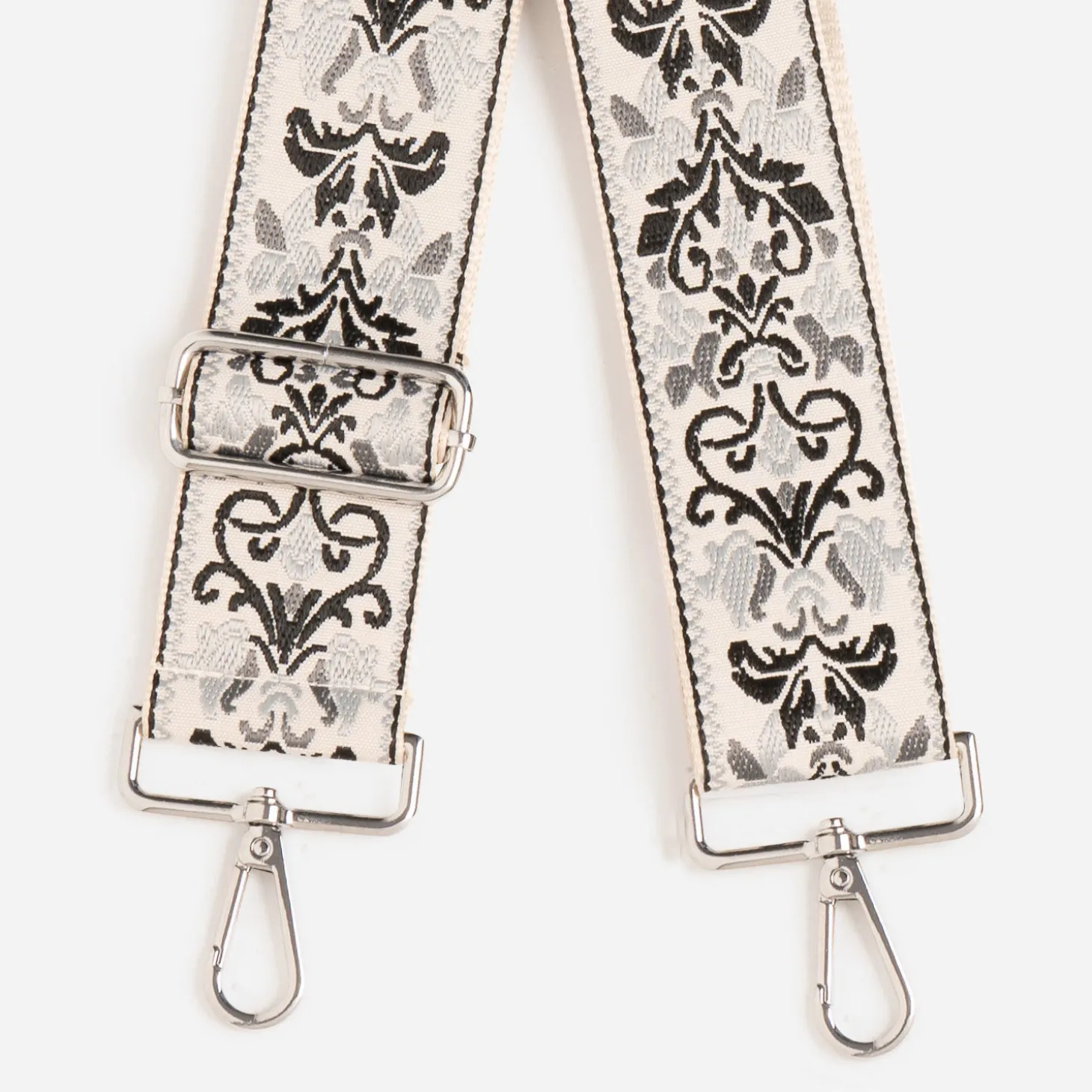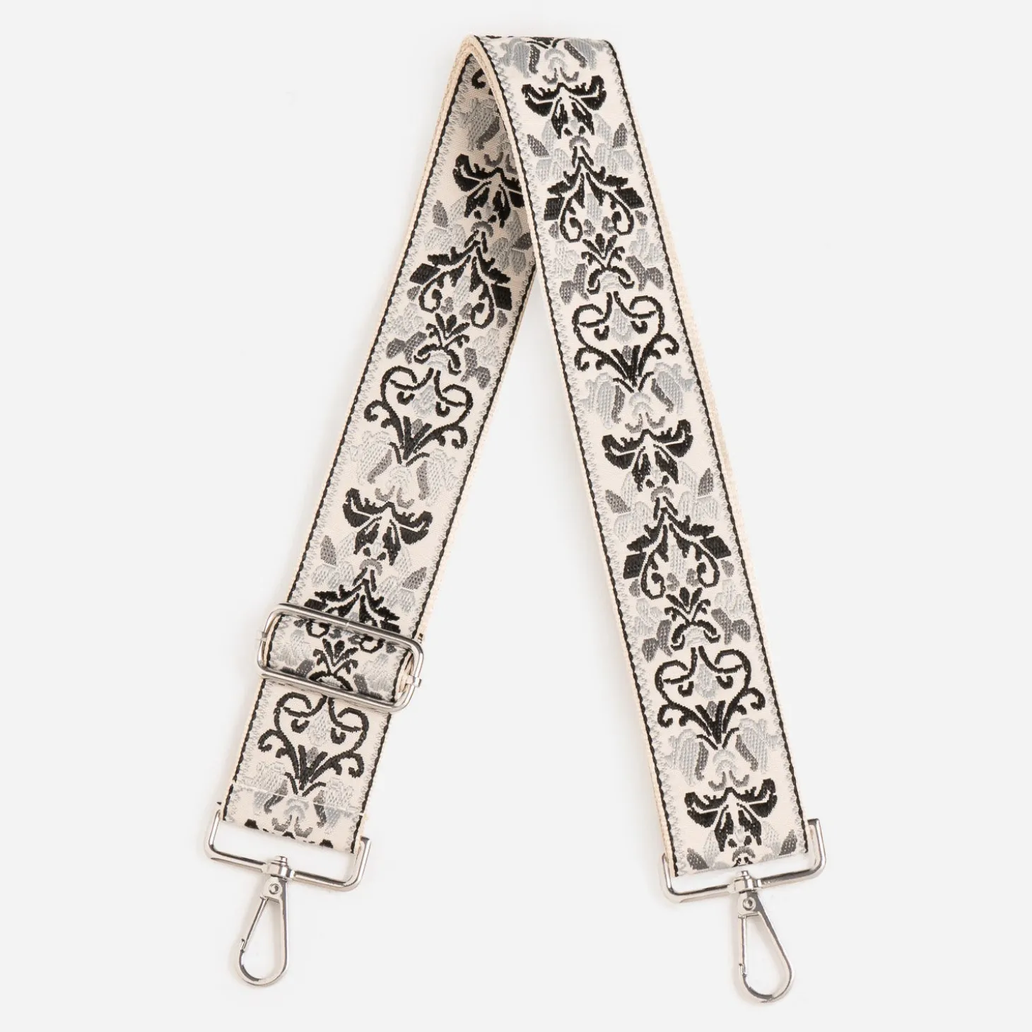 Adaptable sur tous les sacs à main à bandoulière amovible, cette nouvelle version en textile se démarque par un motif baroque gris clair, gris foncé et noir sur fond écru. Réglable, elle s’ajuste pour un porté épaule ou croisé sur le buste. Un accessoire pour twister votre sac préféré.