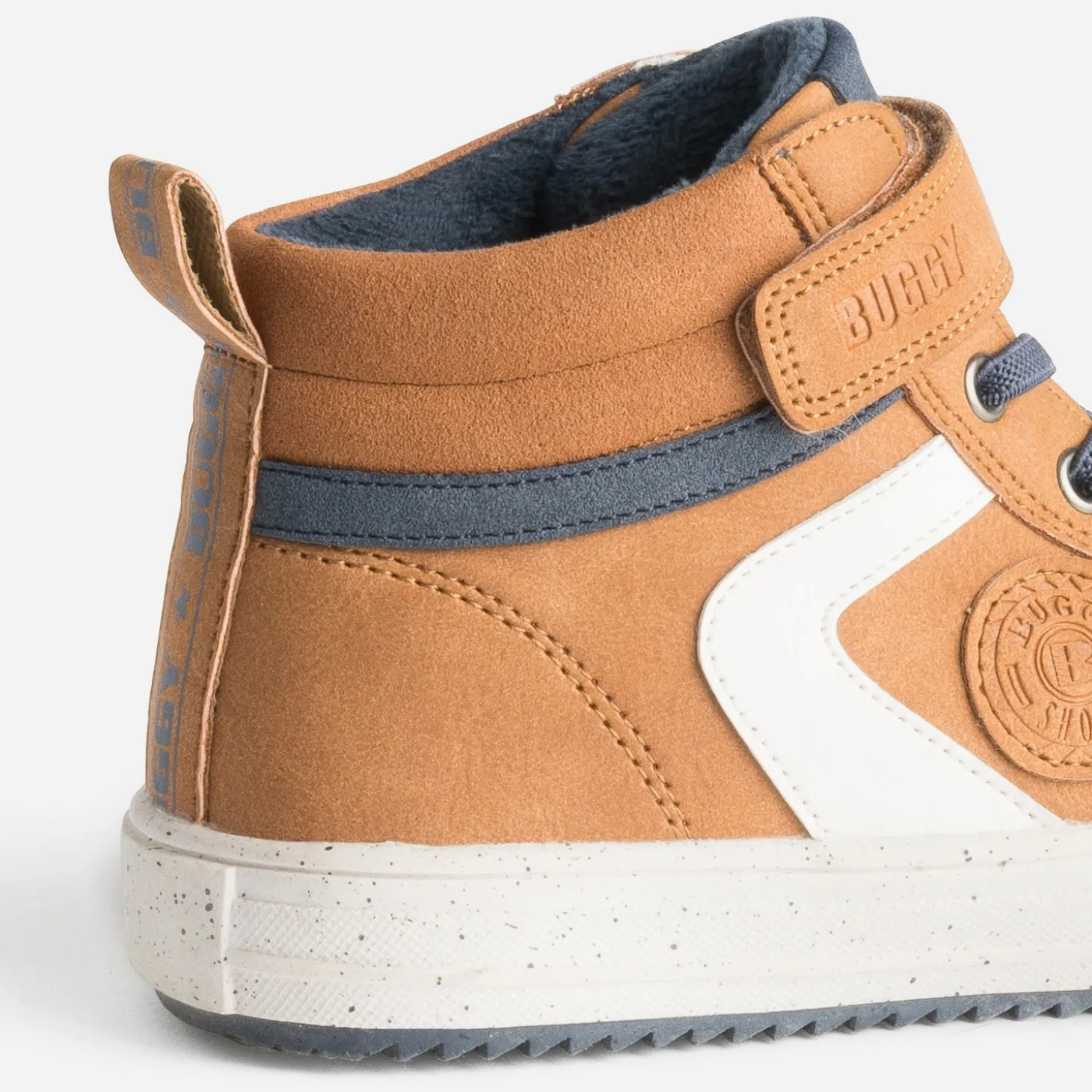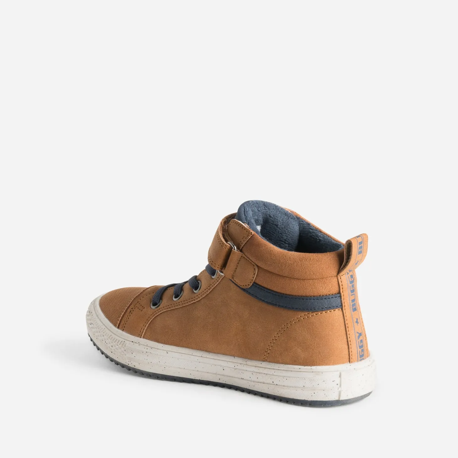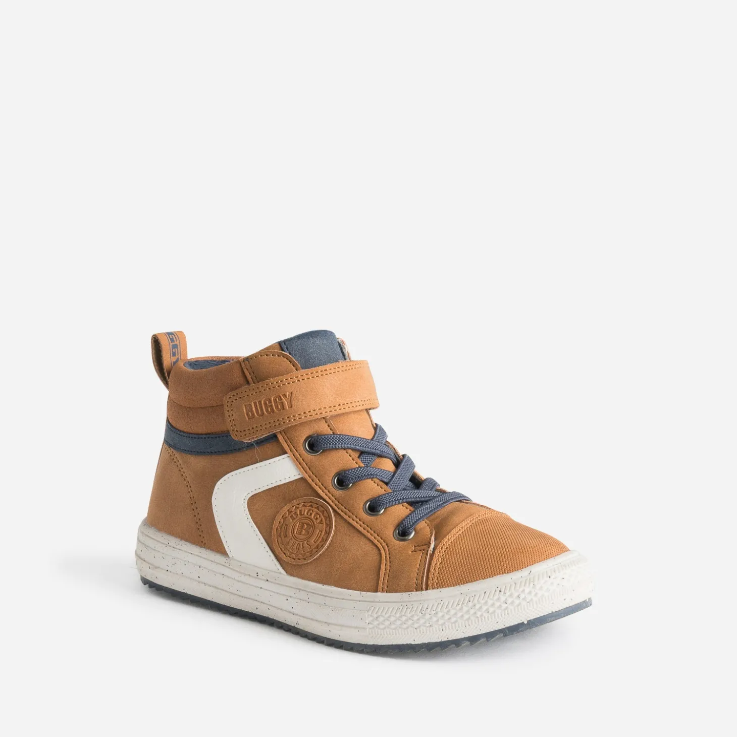 Le rêve d’un enfant, c’est une basket stylée, confortable, qui s’enfile facilement. En matière synthétique, elle se décline en coloris camel, rythmée de découpes écrues et bleu marine. Elle se ferme par un lacet élastiqué et par un scratch. Zoom sur la semelle tachetée et crantée, pour une meilleure adhérence. Sweat, jeans, c’est l’allié de toutes ses tenues du quotidien.