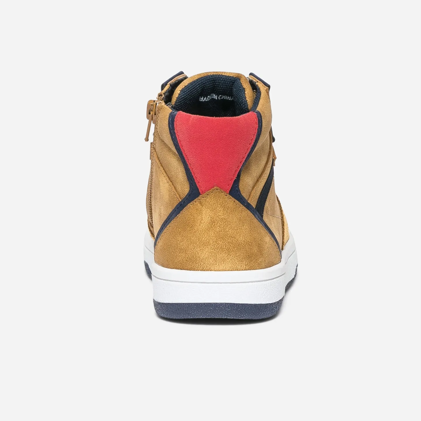 Coup de cœur immédiat pour cette nouvelle basket pour garçon. Coloris camel, elle est conçue en matière synthétique suédée, rythmée, ici et là, de touches bleu marine et rouges. Le lacet est doublé d’un zip intérieur, pour ne pas perdre de temps à se chausser.