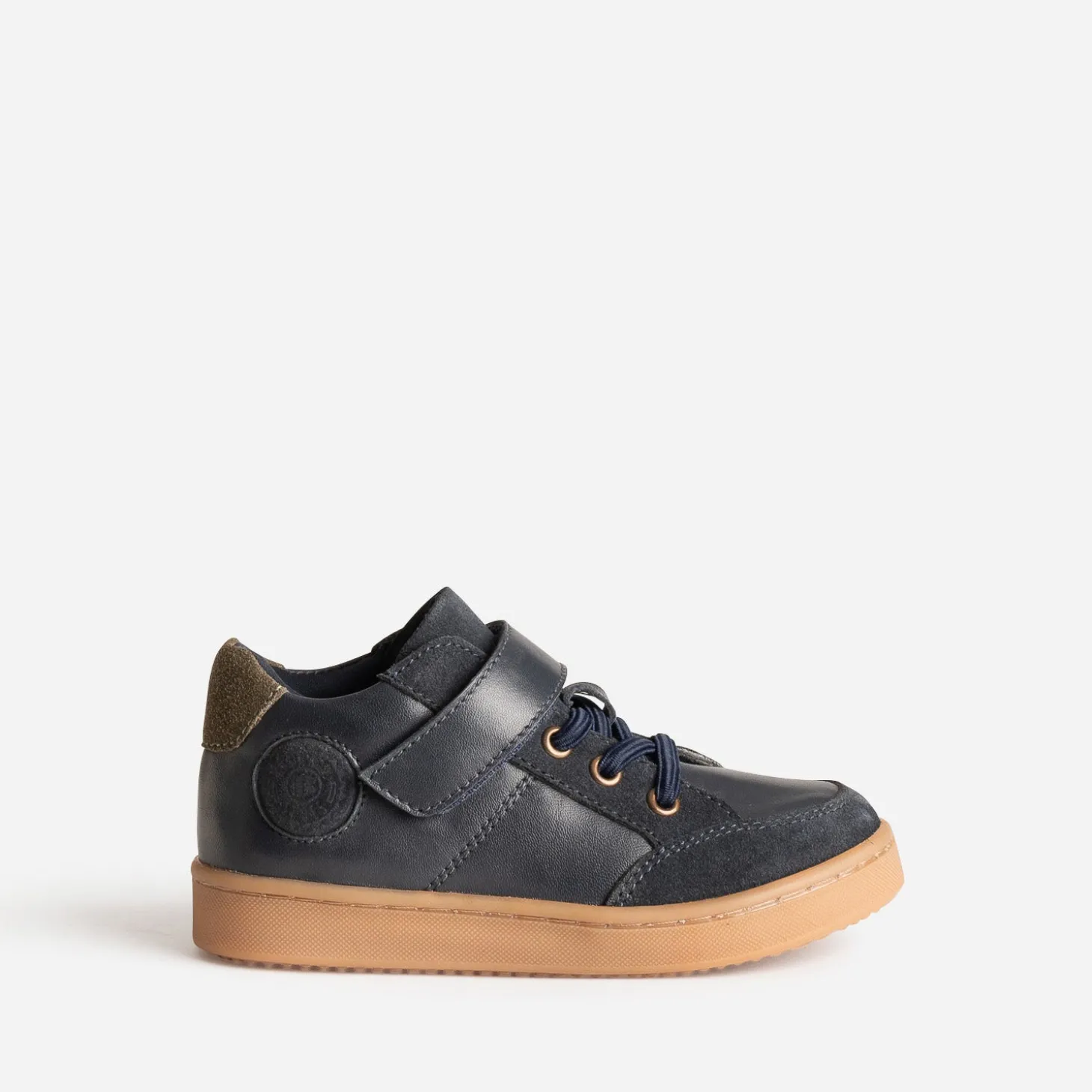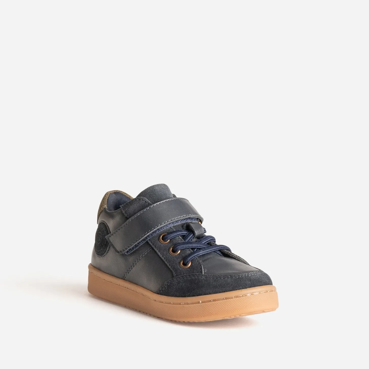 La basket en cuir confirme son statut de complice des enfants. Bleu marine, elle associe cuir lisse et cuir velours dans un bel équilibre. Semelle camel et empiècement kaki sur le contrefort apportent du style. La tige semi-montante maintient le pied par un lacet élastiqué et un scratch. Un modèle qui s’accorde facilement avec tous les looks du quotidien.