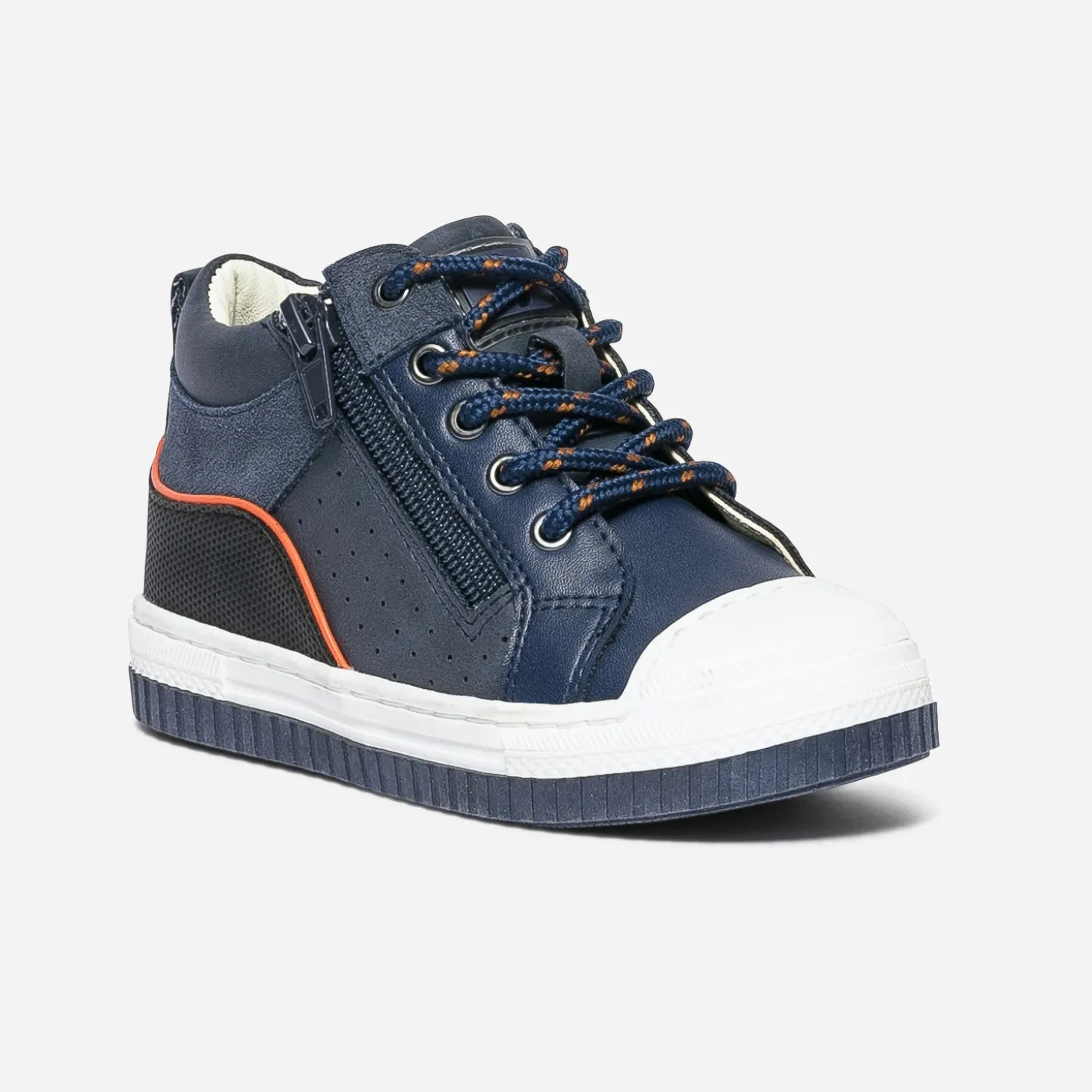 Marcher, courir, sauter, lancer le ballon. Cette basket mi-haute pour garçon est faite pour ça, rien que pour ça. Pour l’accompagner au quotidien, par une matière synthétique facile d’entretien, par un coloris bleu marine souligné d’orange, par un lacet et un double zip, pour simplifier l’entrée et la sortie du pied. Mix matières et bouts renforcés ajoutent une bonne note à l’originalité.
