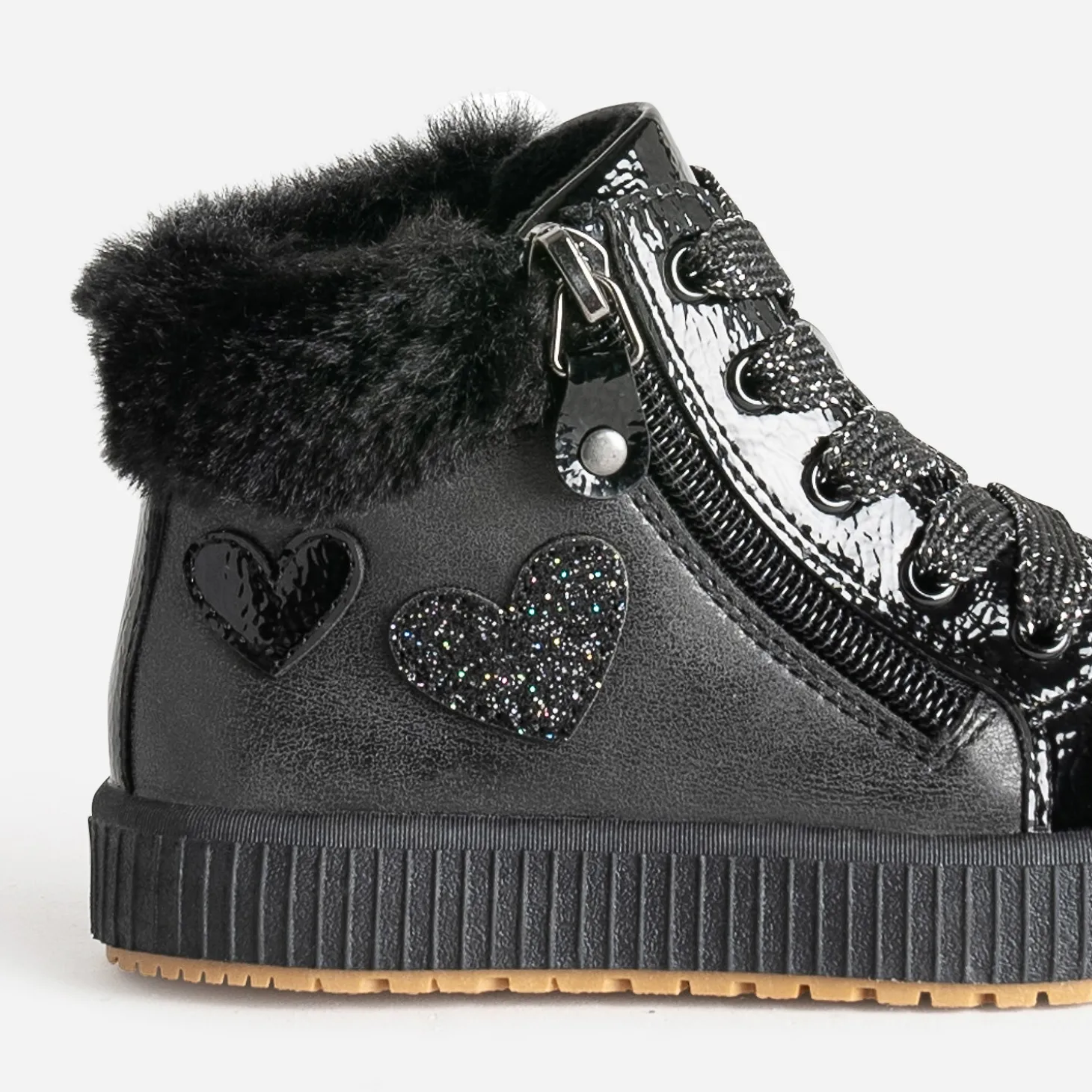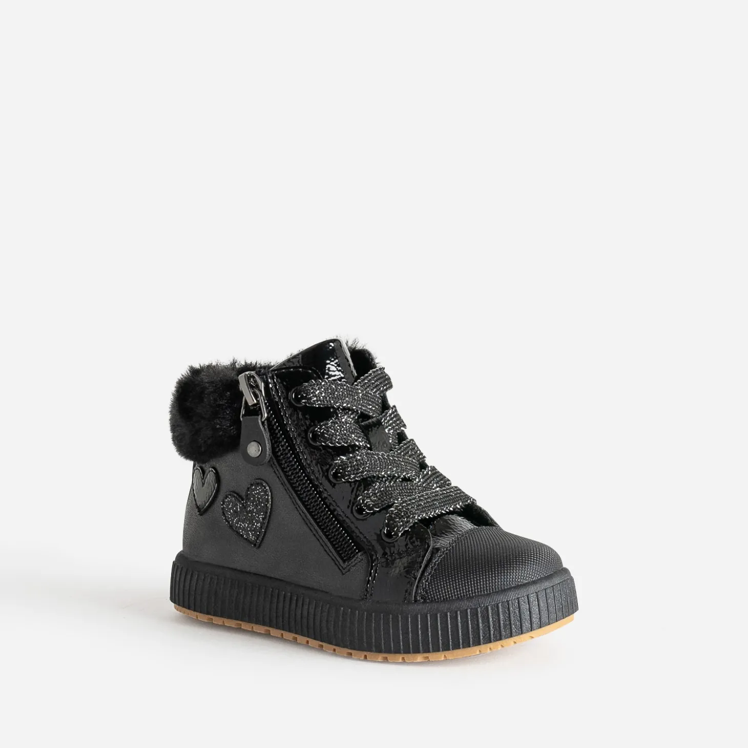 Affinez son style sporty rock, avec cette basket pour petite fille. En matières synthétiques noires, elle allie finitions mates et vernies, dans une belle harmonie. Cœurs sur le côté, bout renforcé, matière fourrée à la cheville : les détails sont particulièrement soignés. Elle se ferme par un lacet pailleté, doublé d’un zip latéral. Un modèle à jouer avec son jogging préféré, ou une robe-pull en molleton gris.