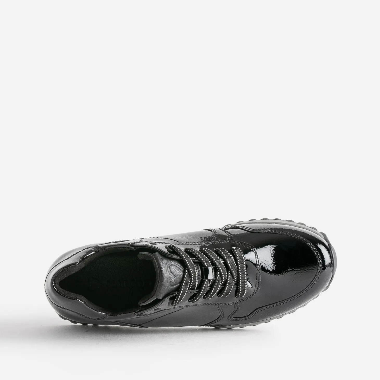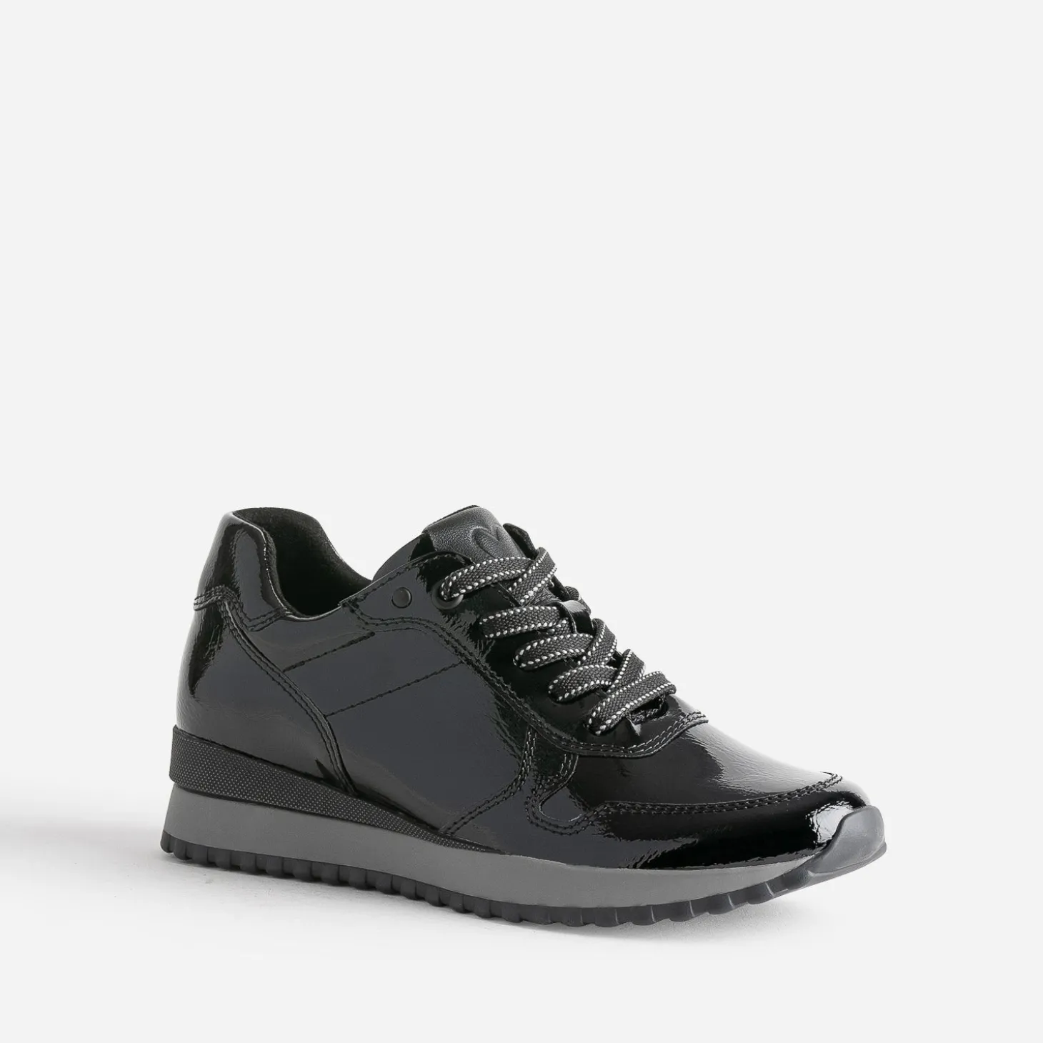 Modernité et style ne sont pas incompatibles. La preuve avec cette tennis femme. En matière synthétique noire, elle est twistée d’une finition vernie, au chic évident. Légèrement compensée, elle est parfaite pour l’entrée de saison.