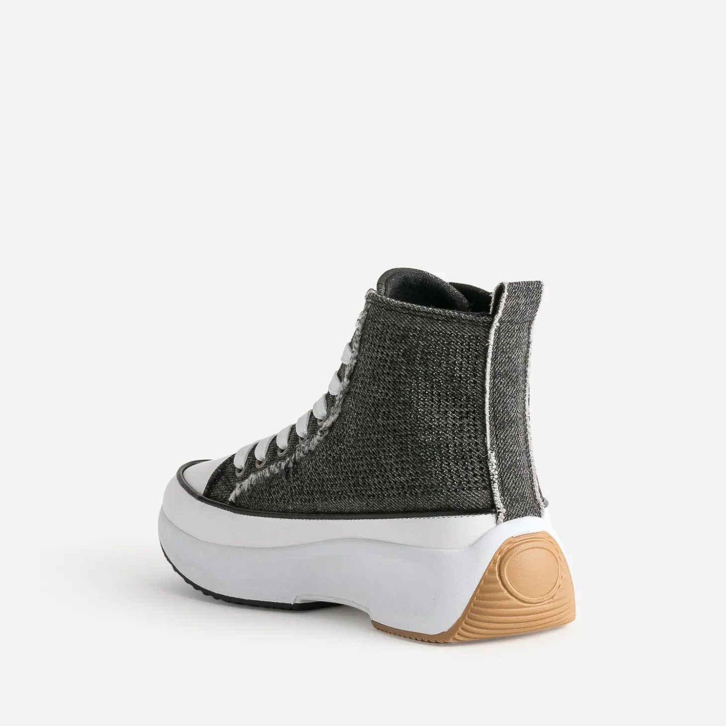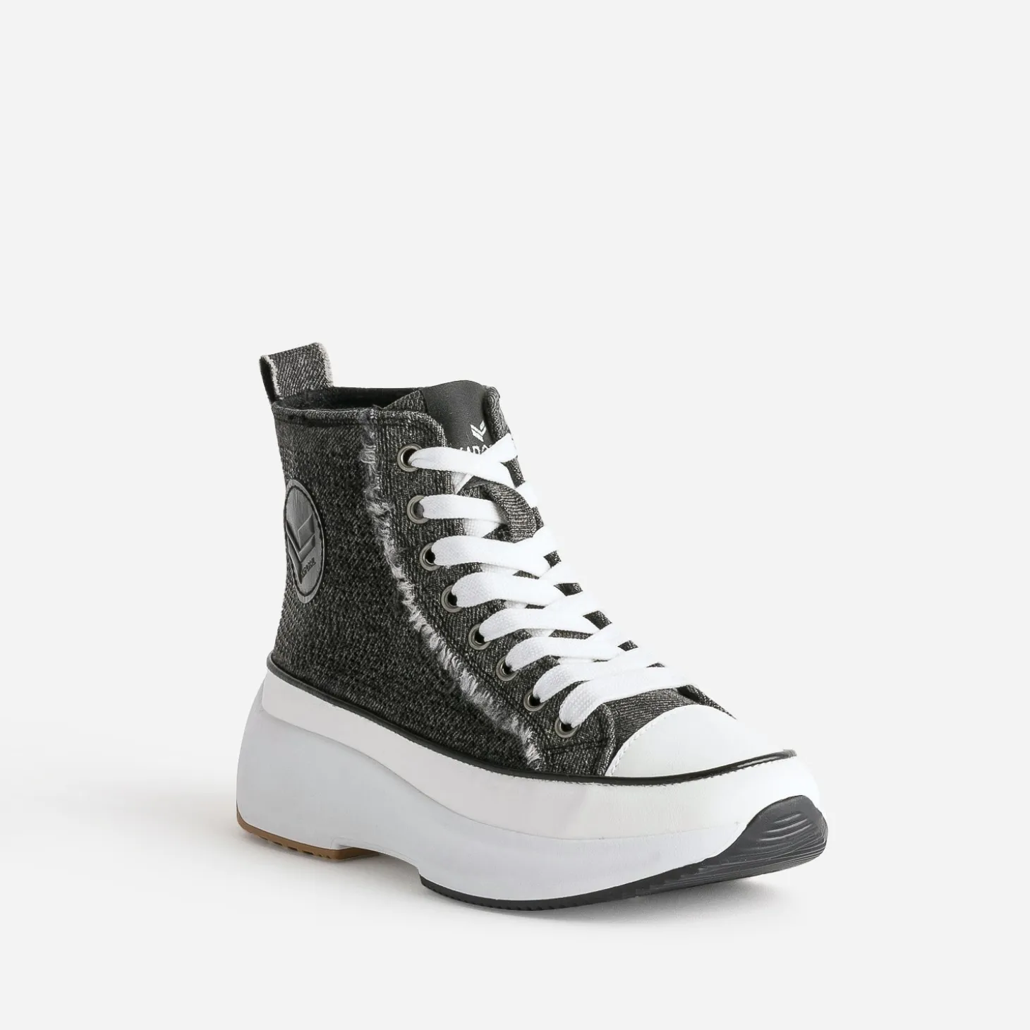Entrez dans la saison hivernale avec cette basket montante pour femme. En textile façon denim gris anthracite, elle affirme son style mode par des strass noirs sur les côtés et des bords frangés sur les pattes de laçage et le galon. Montée sur une semelle à plateforme, elle permet de prendre de la hauteur sans effort. Un modèle à porter avec une tenue à l’esprit décontracté : crop top, pantalon large et casquette.