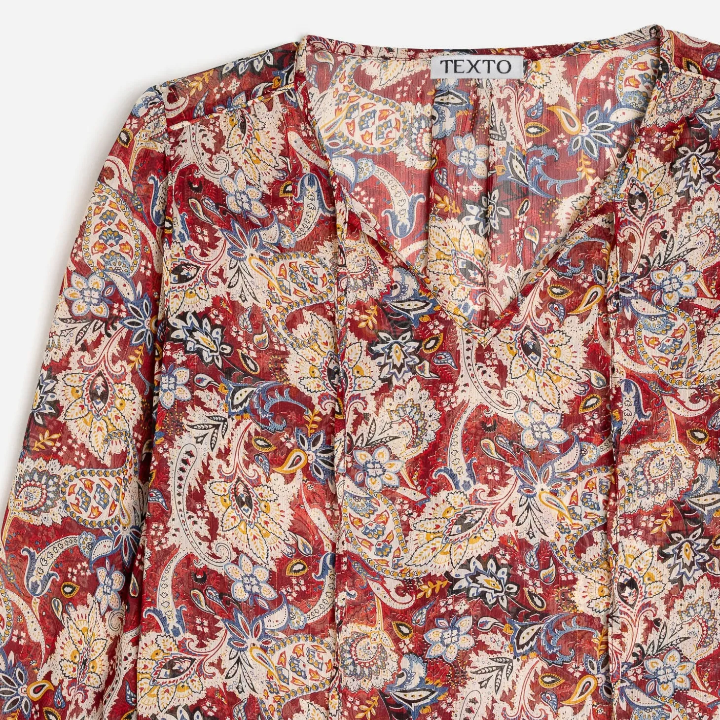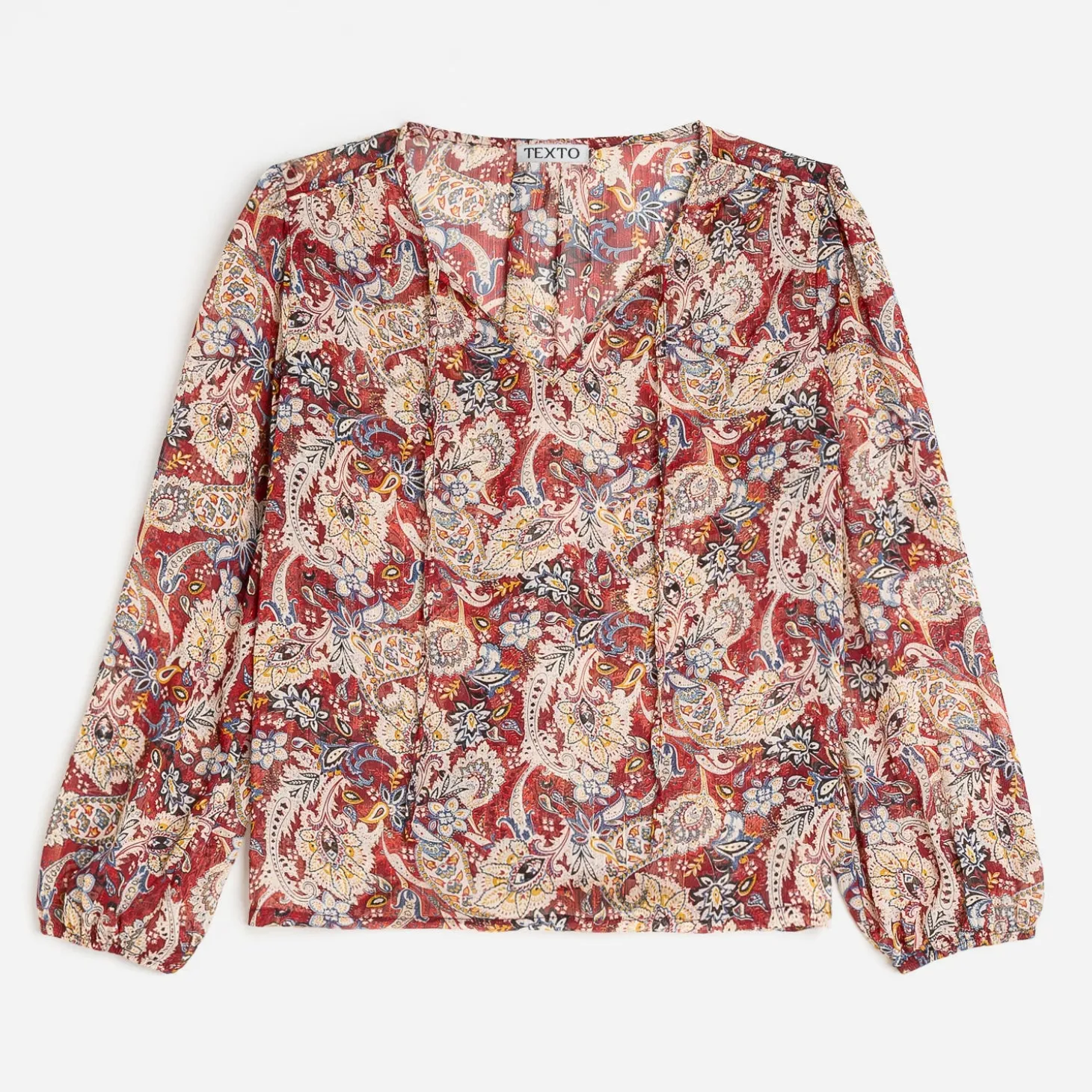 Une jolie blouse imprimée, c’est l’assurance d’un look facile à porter. En voile rouge, elle se démarque par son imprimé cachemire floral, rehaussé de fines rayures dorées.