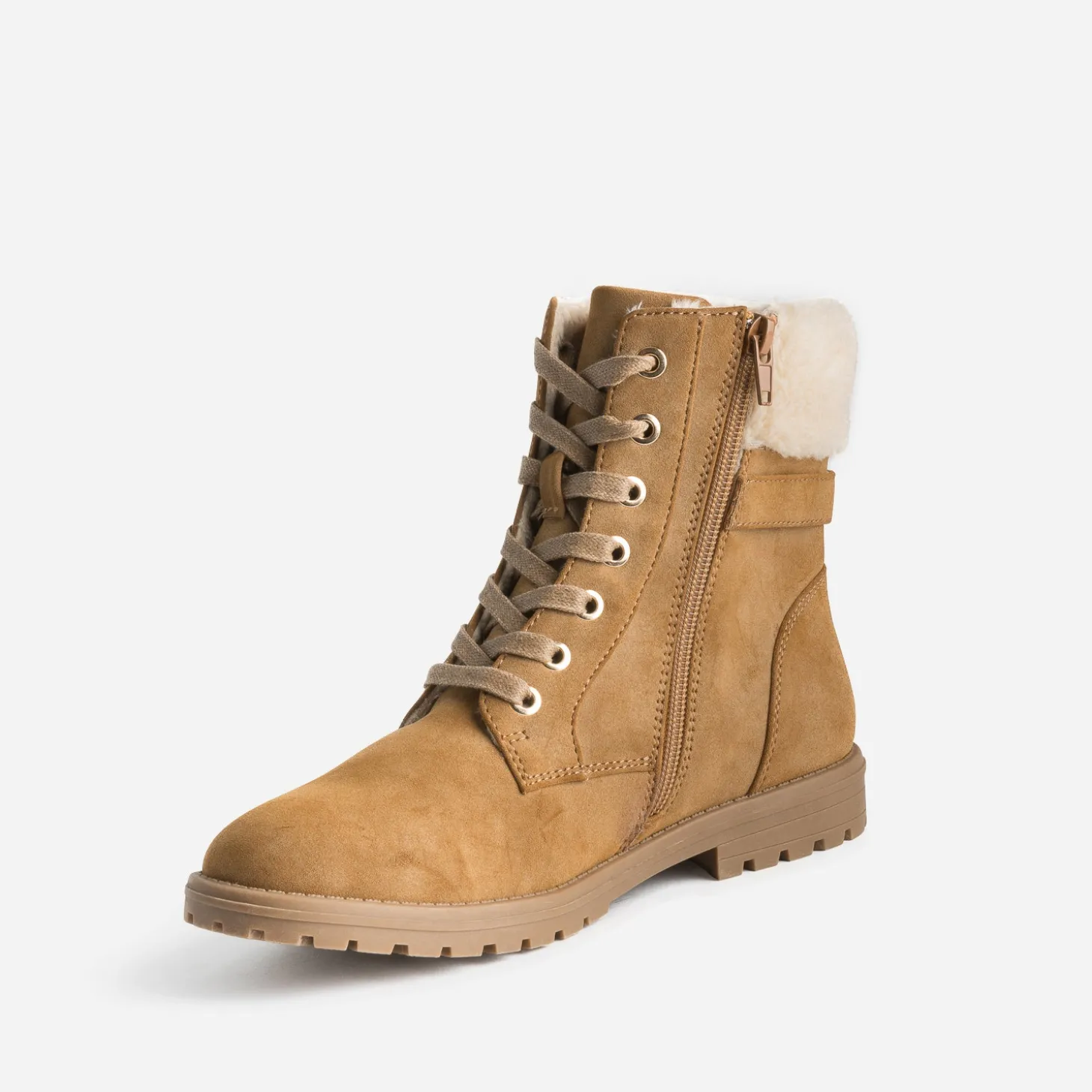 Plein hiver oblige, réchauffez les pieds de votre junior fille avec un boots adapté. En matière synthétique suédé, il se décline en coloris camel, avec doublure en textile fourré, jusqu’en haut de la tige. Lacet plat et zip intérieur facilitent l’entrée et la sortie du pied. Optez pour un look d’inspiration workwear, avec des pièces en denim et une surchemise à carreaux.