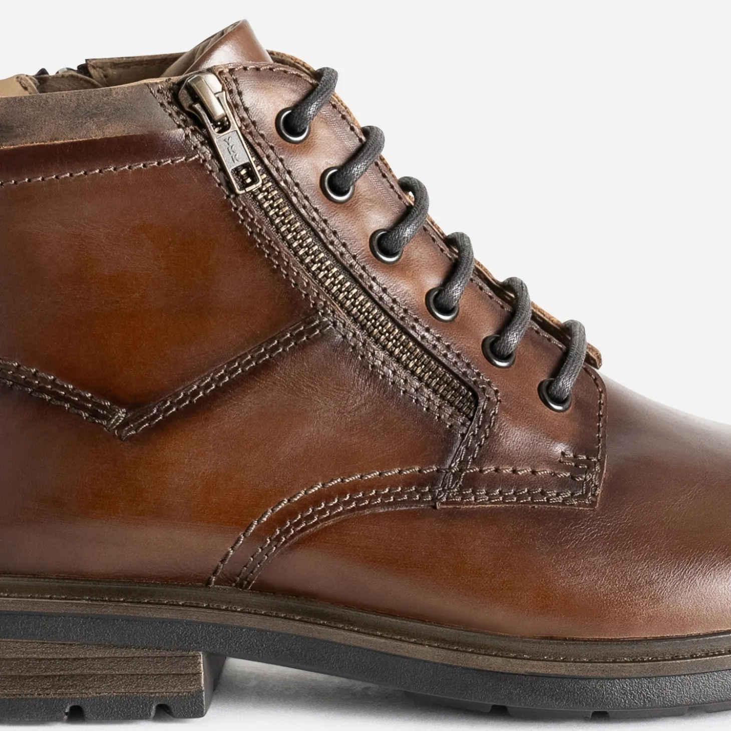 Dessus en cuir, doublure mix-matière, semelle première en cuir : ce boots pour homme mise sur la qualité et le confort. Coloris marron, il présente un effet patiné sur le bout du pied, une fermeture par lacet, avec zip latéral, et un motif carreaux à l’intérieur. Un modèle alternatif au derby, avec un maintien parfait de la cheville. A associer avec un pull à col roulé marine et un jean brut.