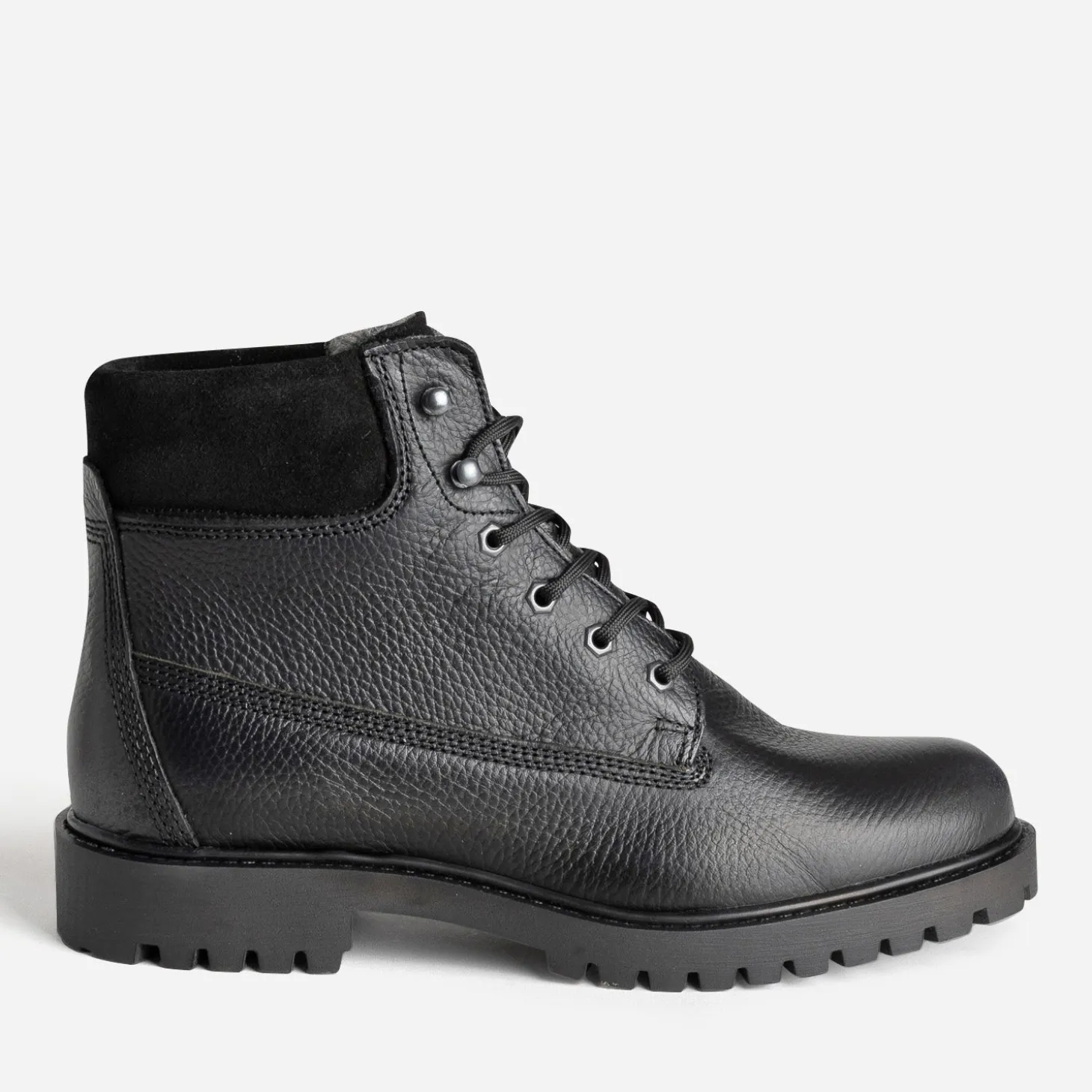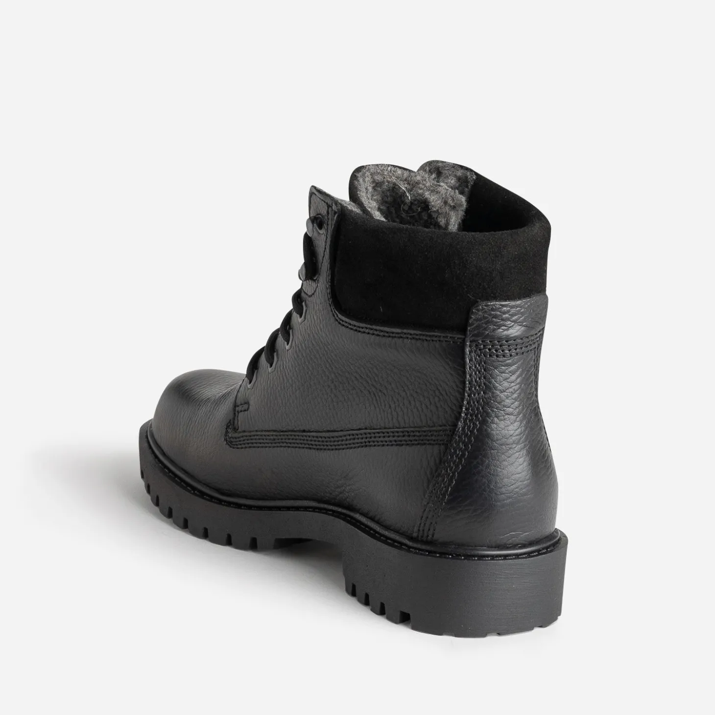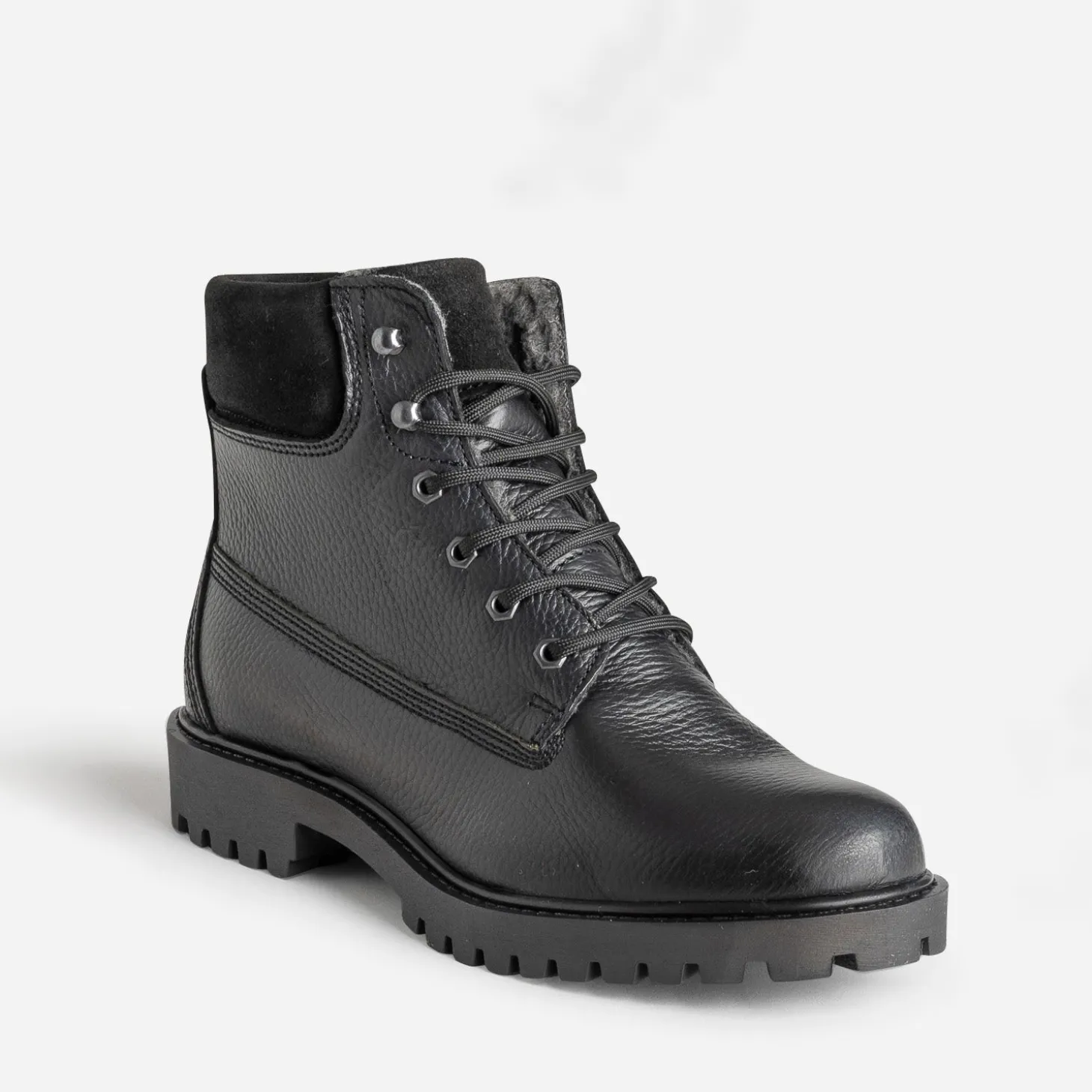 Ce boots en cuir noir pour homme est conçu pour l’hiver. Il présente une semelle crantée, une tige matelassée, un contrefort bi-matière et une doublure fourrée pour un confort optimal et se ferme par un lacet rond ton sur ton. Un modèle inscrit dans la tendance workwear, à porter avec un jean et une surchemise ou une parka bien chaude.