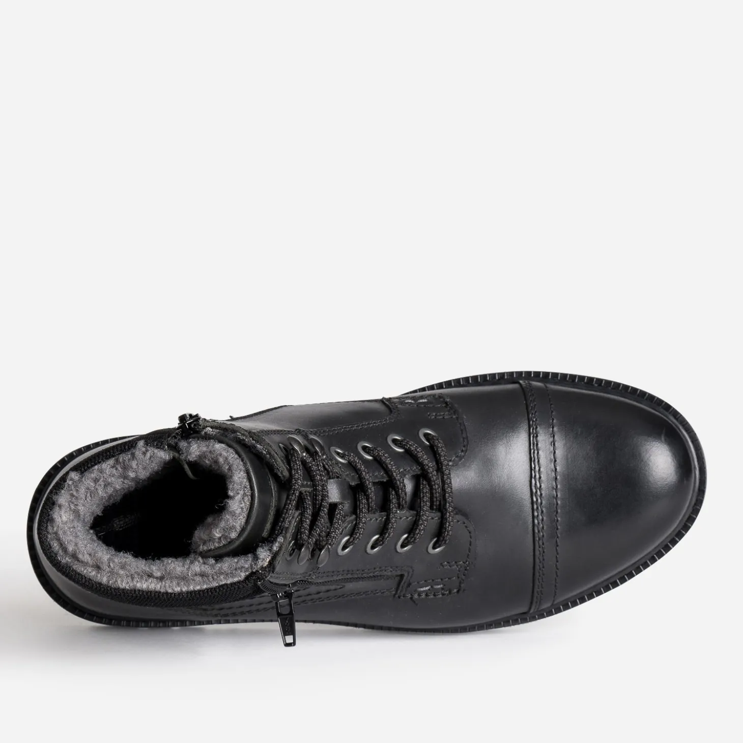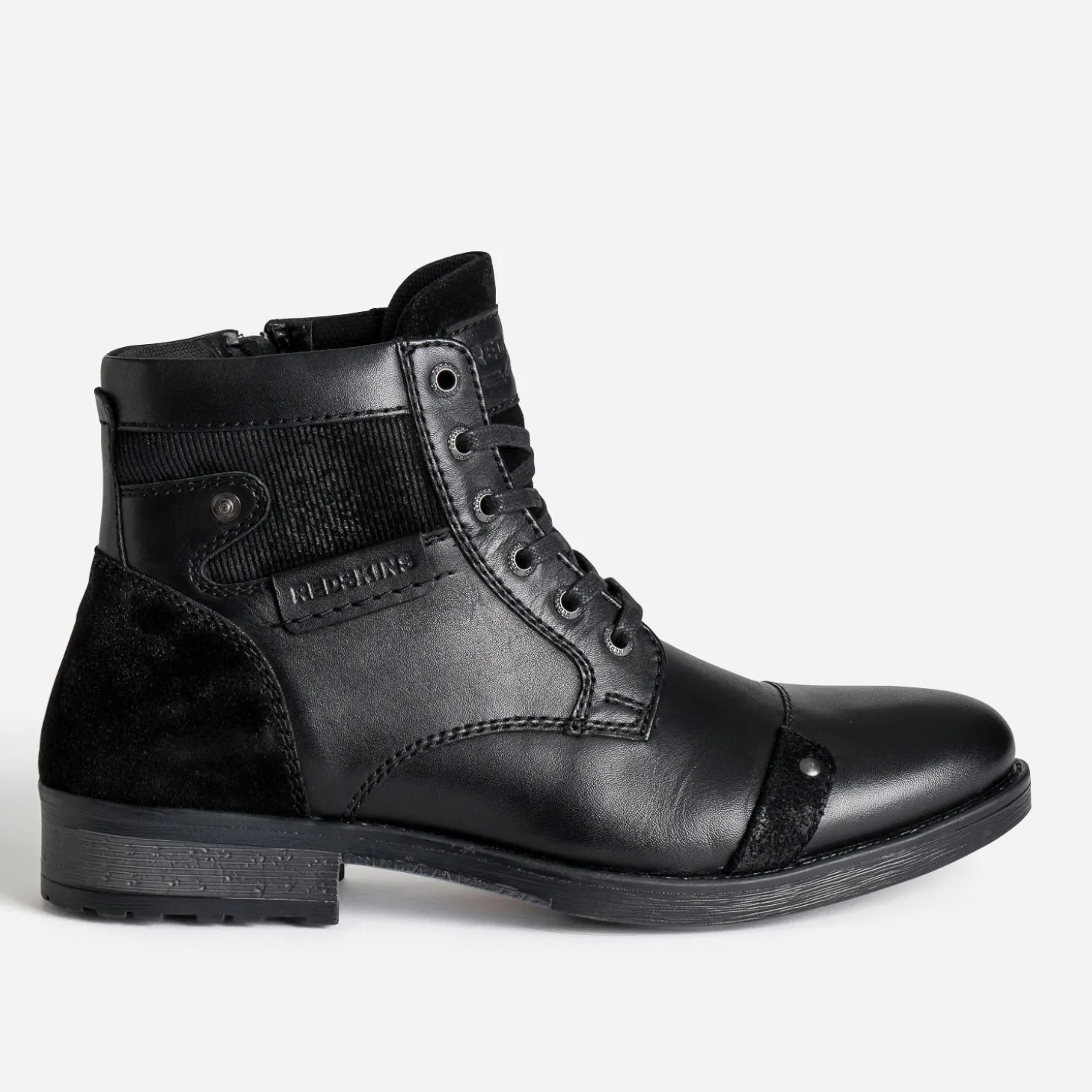 Esprit worker testé et approuvé avec ce boots pour homme. En cuir lisse noir, il se démarque par des empiècements en cuir velours sur le côté et le contrefort, et un empiècement en textile velours milleraies sur le haut de la tige. Un modèle à assumer avec un total look denim noir, plus ou moins délavé.