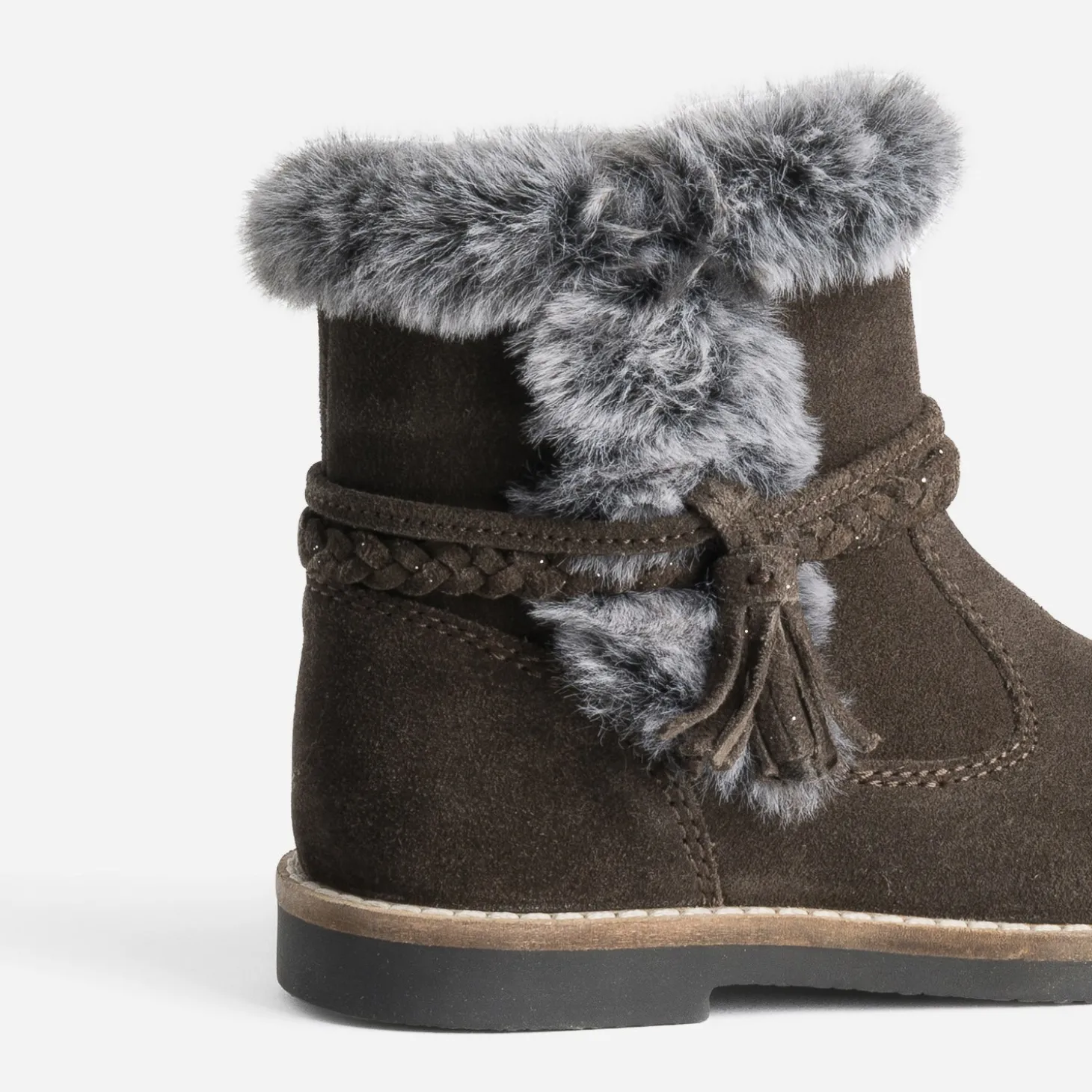 Ce boots fille est une valeur sûre du shoesing d’hiver. En cuir velours, il se décline en coloris marron foncé, décoré d’une double bride, l’une avec pampille et l’autre tressée. Le haut de la tige est bordé de matière fourrée, et il se ferme par un zip intérieur, pour faciliter l’entrée du pied. Un modèle idéal, autant avec les robes qu’avec les pantalons et les jeans.