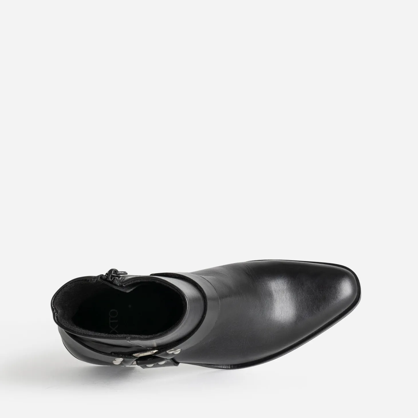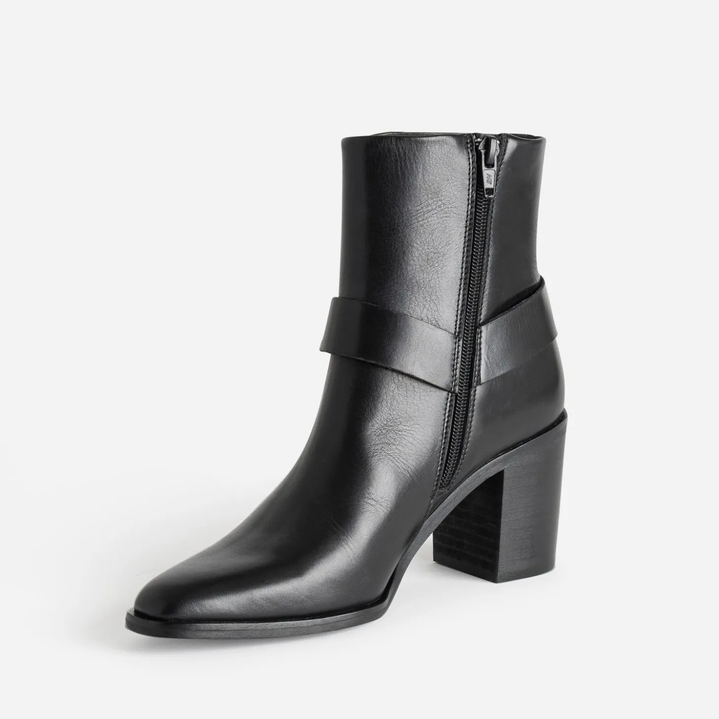 Pas facile de choisir entre l’élégance d’un talon haut et l’esprit motard ? Ce boots femme est LA réponse à toutes vos envies. En cuir noir, il séduit par son bout affiné, son talon carré de 7,5 cm de haut, parfaitement stable, et ses brides sur la cheville, maintenues par des rivets et un anneau en métal. Tout y est. Un modèle qui allonge résolument la silhouette, si vous l’associer à un manteau extra long, tendance majeure de la saison, offrant une silhouette imposante et sophistiquée.