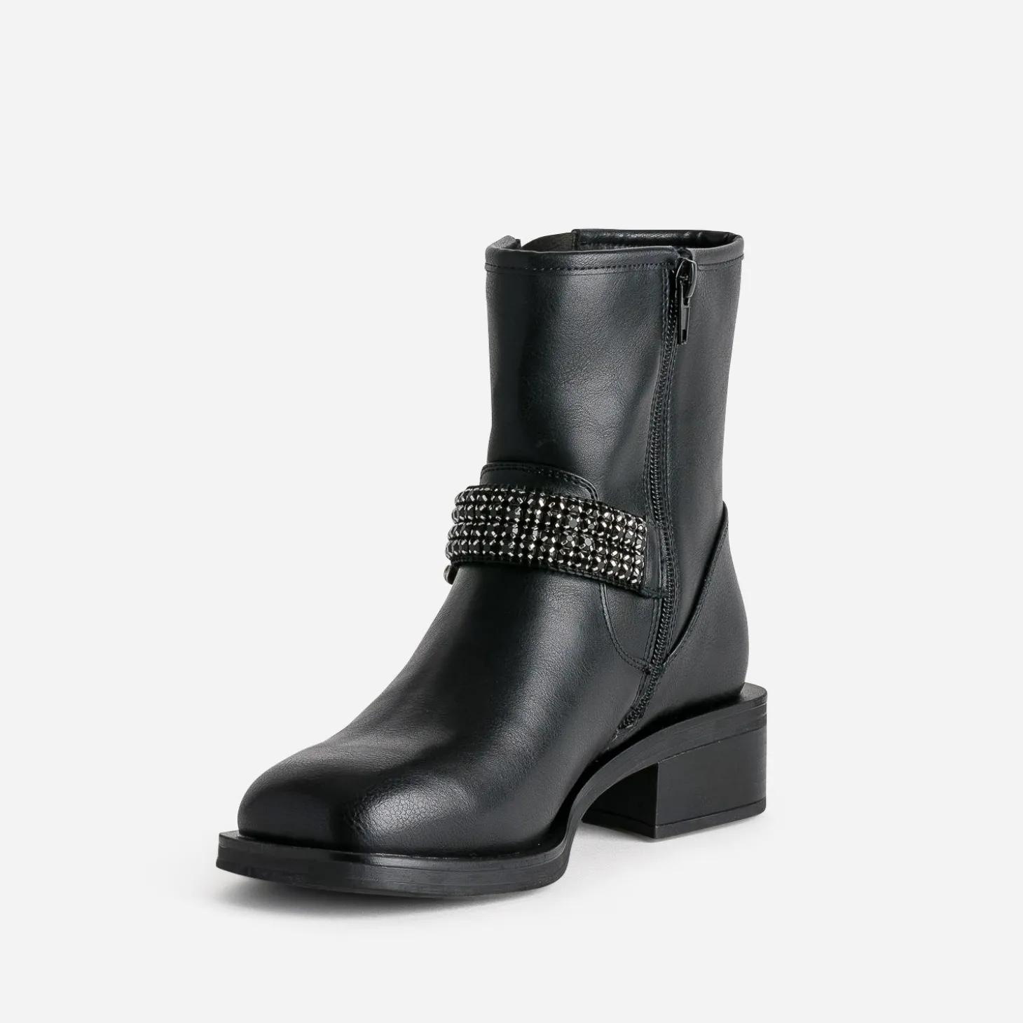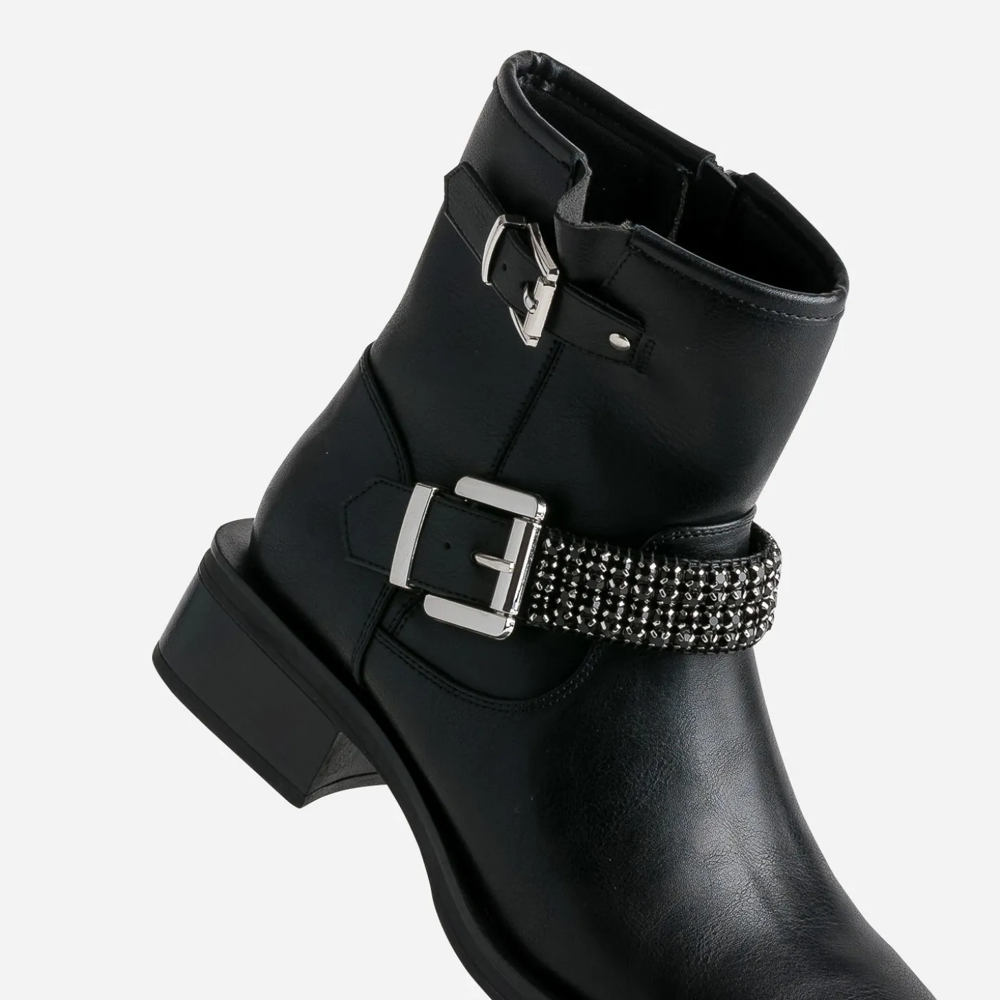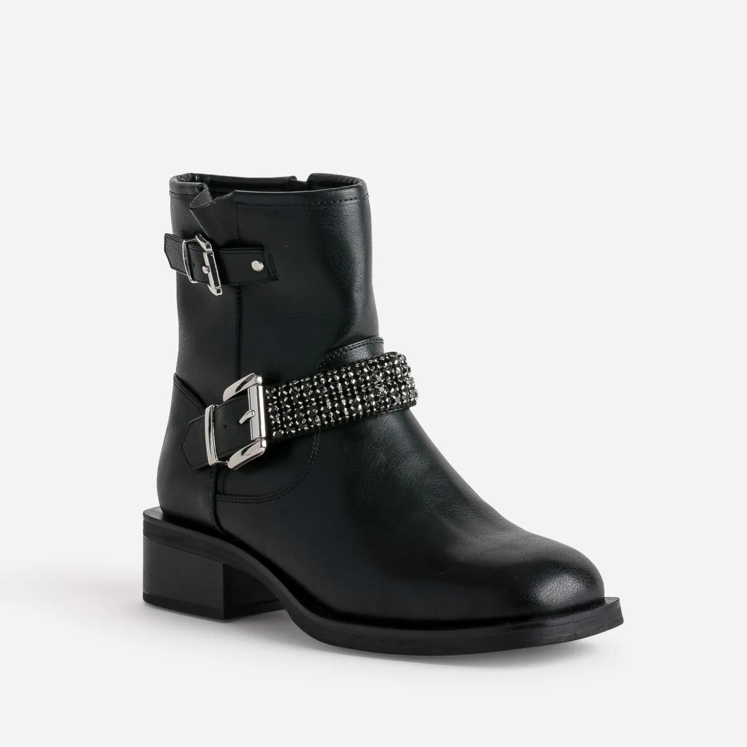 Ne résistez pas à l’appel du style motard. Laissez-vous transporter par son caractère racé, marqué par un bout et un talon carrés. En matière synthétique noire, il ose, le pas de côté, en revisitant la bride avec féminité : un décor de strass facettés ton sur ton. Un modèle à associer avec un tee-shirt gris lamé sous un blazer noir, et un jean slim noir, sans oublier maxi manchette et sac souple sur l’avant bras.