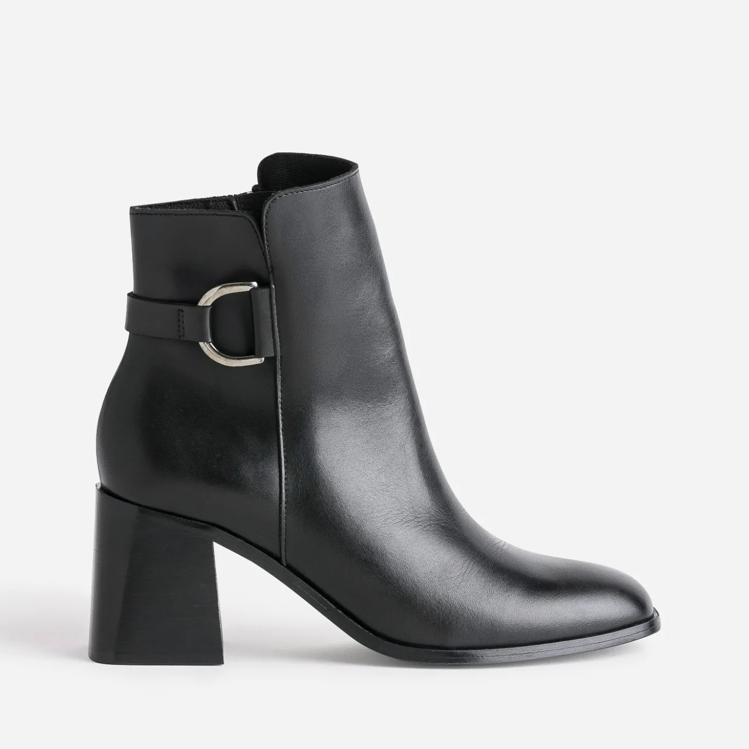 Le boots femme a ce je-ne-sais-quoi d’intemporel et d’élégant, en toutes circonstances. En cuir noir, il est monté sur un talon légèrement flare de 7 cm, présente un bout carré et une tige asymétrique, soulignée d’une bride arrière avec un anneau en D. En costume-pantalon ou en robe fluide, il affectionne le style masculin-féminin, sans pareil.