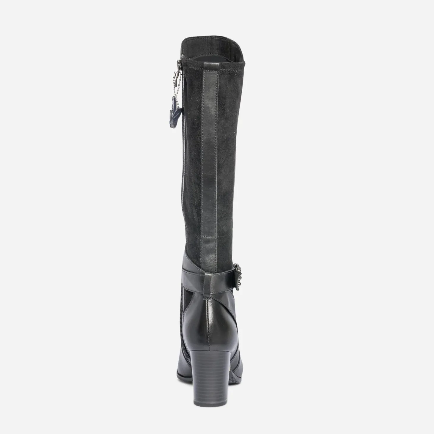 Spécialiste du bien-être, la marque CAPRICE propose des chaussures au confort incomparable. Cet hiver encore, la botte à la côte. En première ligne des podiums, elle séduit par sa tige haute animée d’un jeu bi matière, associant cuir lisse et textile dans une découpe bien pensée. La bride vient mettre en valeur la cheville, avec une double boucle en métal gun. Elle est montée sur un talon d’une hauteur idéale, qui ne ralentira pas votre quotidien.