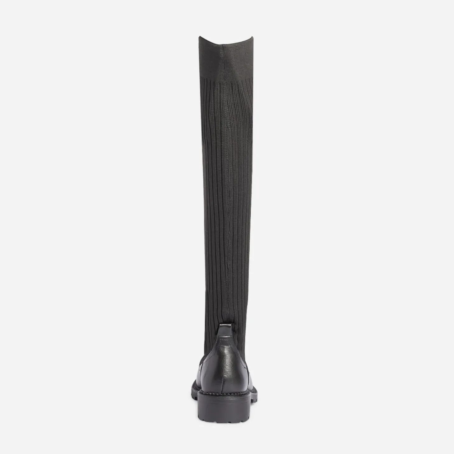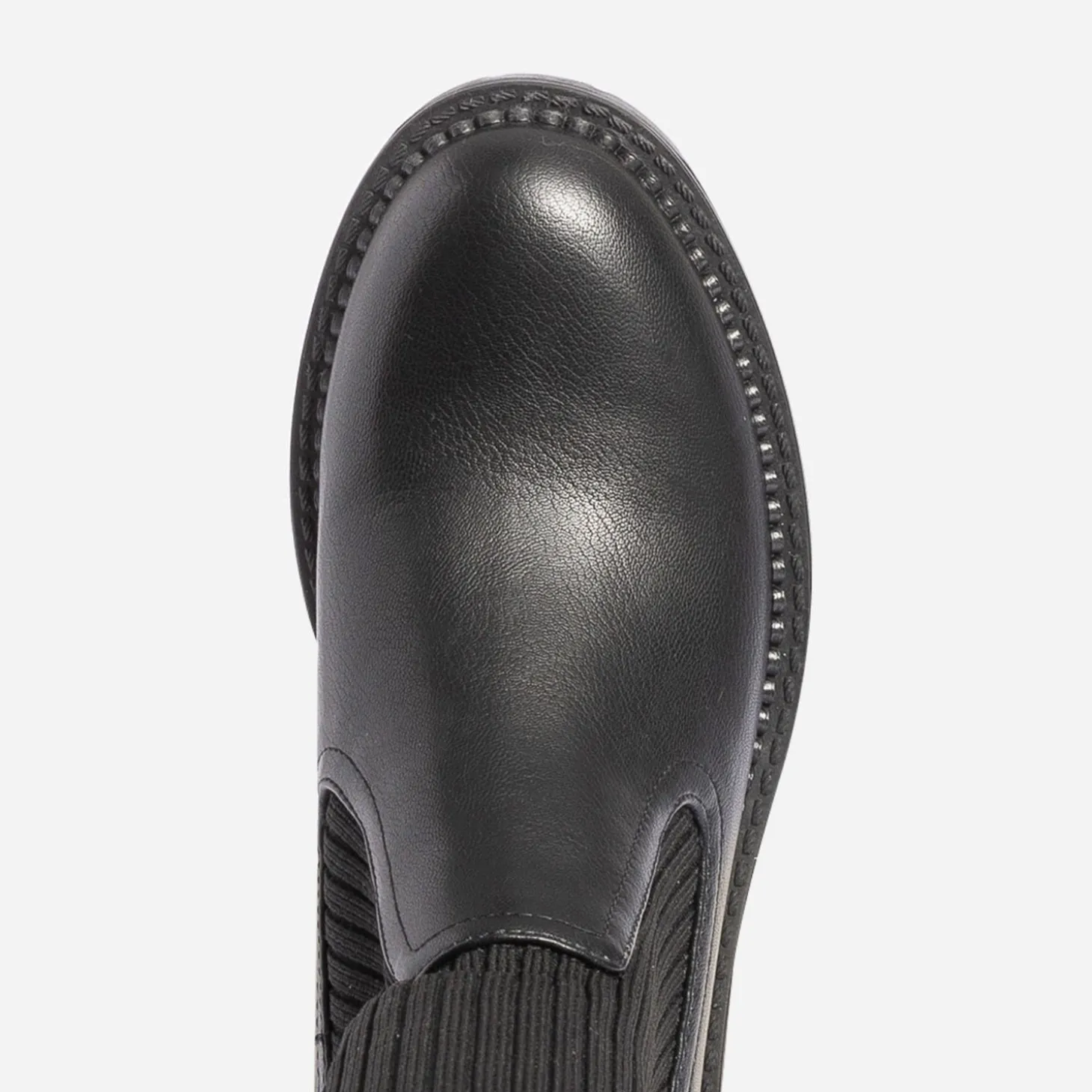 Duo de matières maîtrisé pour look ultra stylé. La botte pour femme n’a pas dit son dernier mot ! En cuir synthétique noir, elle se démarque par une tige élastiquée côtelée façon chaussette ton sur ton, qui vient complètement épouser la forme du mollet. Monté sur une semelle crantée, elle s’invite sur tous les catwalks urbains, en journée comme en soirée. Un modèle à privilégier avec un bas court, par exemple avec une jupe en tartan rouge, incontournable cette saison, et un pull à col roulé noir.