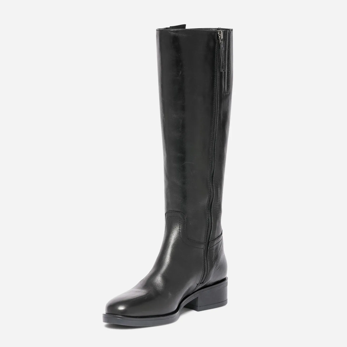 Cet hiver, le cuir est partout, et notamment en total look jusqu’aux pieds. Alors la botte est assurément votre meilleure alliée. Noire, elle présente une ligne classique, avec bout amande et talon décroché, et gagne en style et en confort, grâce aux deux pattes placées sur le haut de la tige et fermées par des boucles carrées en métal argenté : elles s’ajustent en fonction de votre tour de mollet. Jouez l’esprit militaire, avec des tons kaki ou gris.