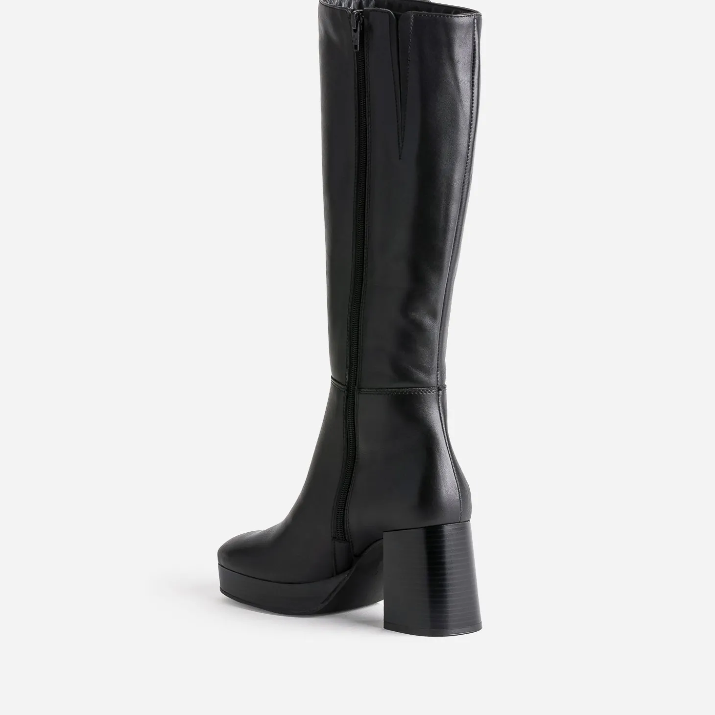 Une tige toujours plus haute. Un talon toujours plus flare. Une plateforme toujours plus disco. Laissez-vous tenter par cette botte femme. En cuir noir, elle est montée sur un talon de 8 cm et un patin avant de 2 cm. L’occasion de sortir en robe chasuble ou en mini-short à paillettes !