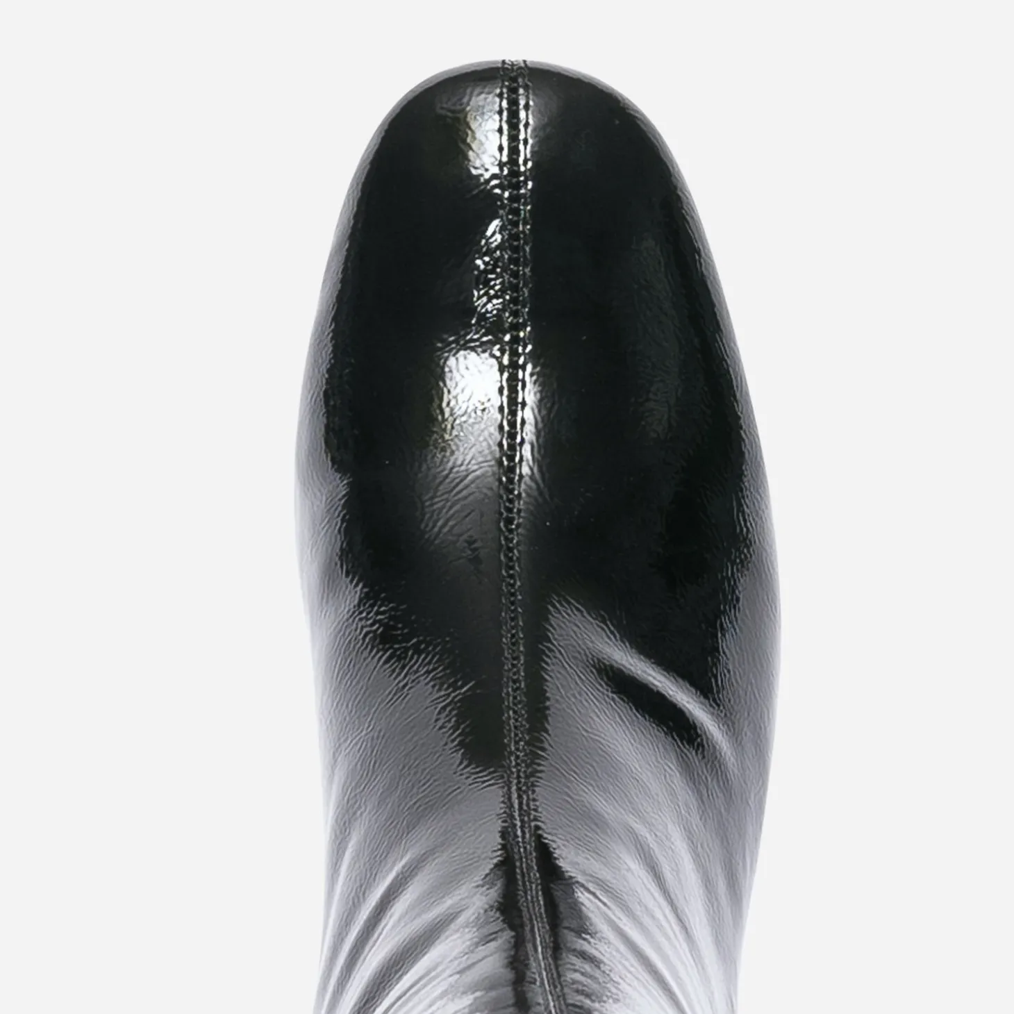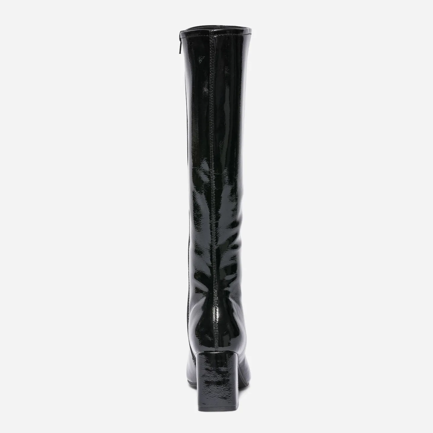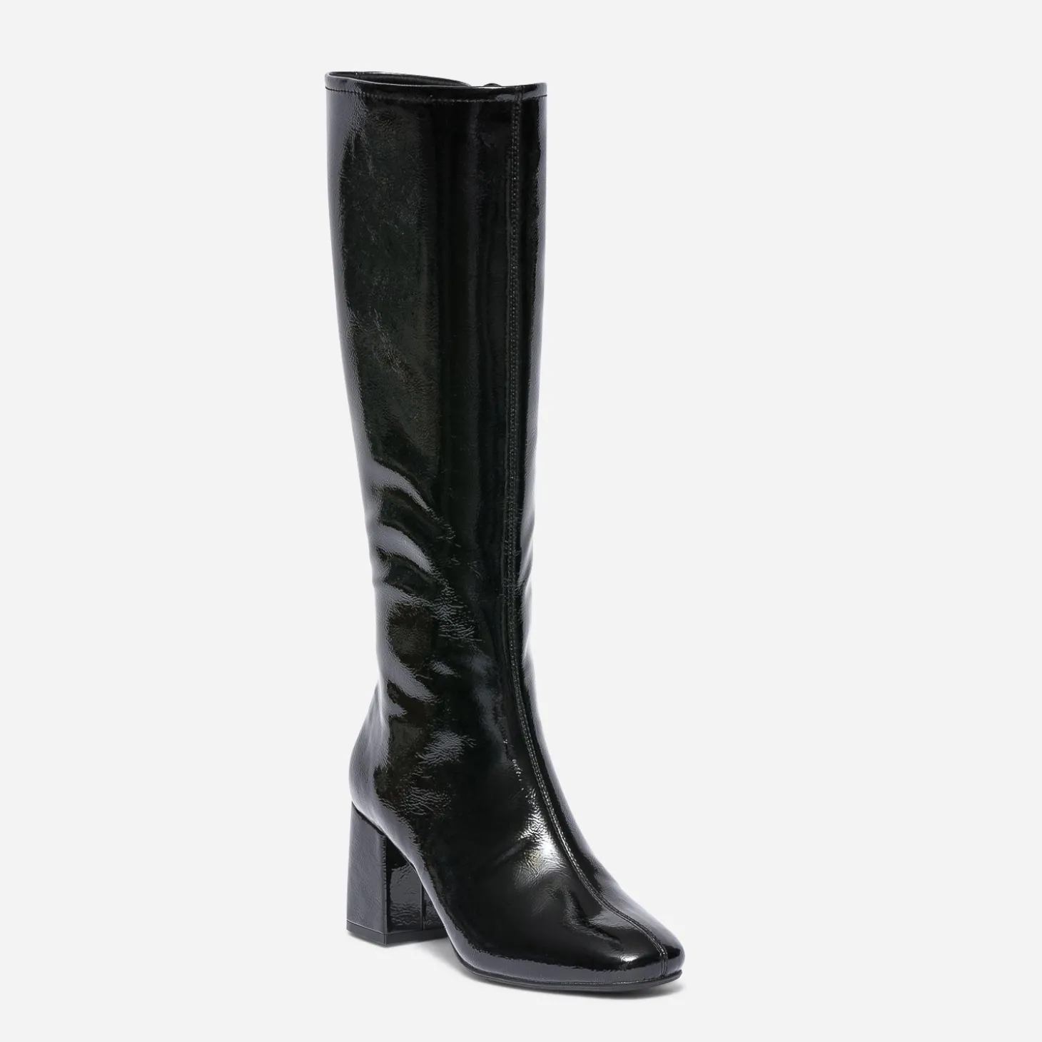 La tentation est grande ! Matière synthétique souple, coloris noir intemporel et finition vernie, cette botte sort le grand jeu pour vous séduire. Elle est montée sur un talon carré de 7 cm, idéal au quotidien. Faites l’essai avec un pull chaussette et une jupe trapèze, ou bien avec un combi short et des collants plumetis, et vous ne pourrez plus les quitter. Tour de mollet (pointure 37) : 36 cm