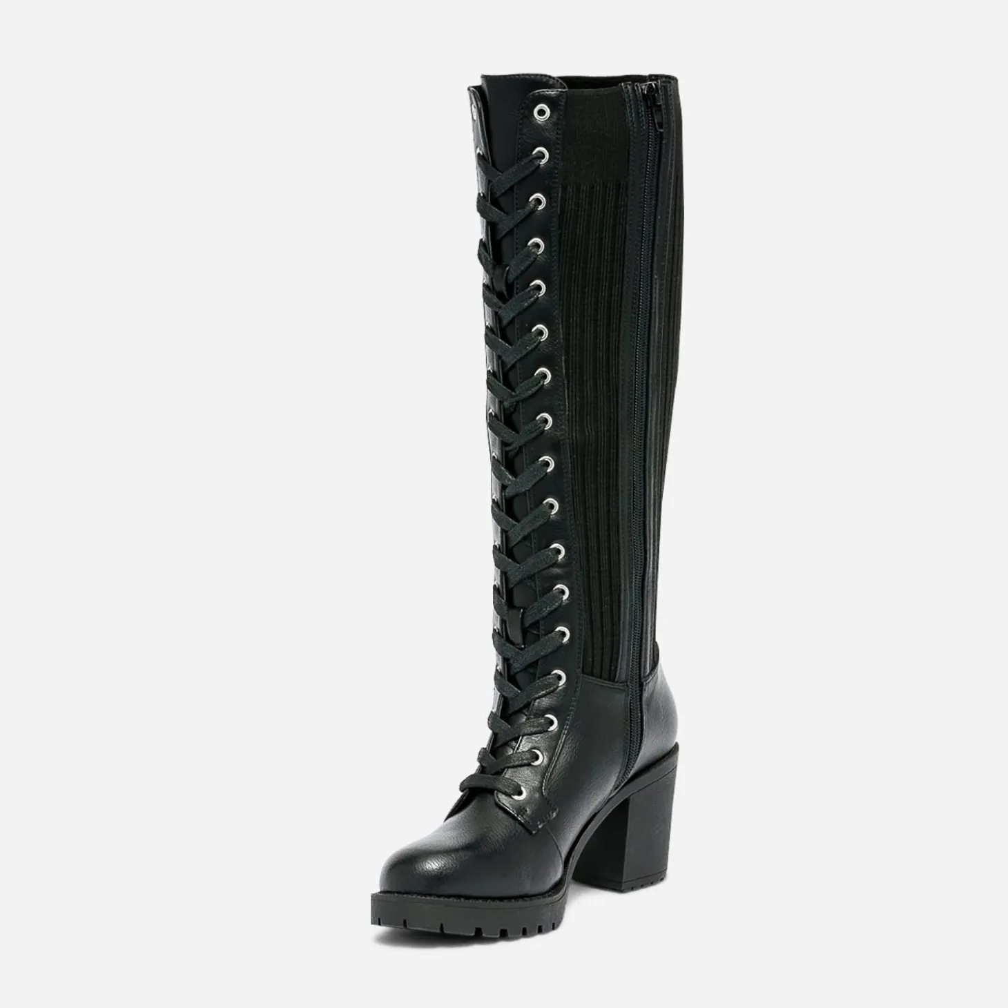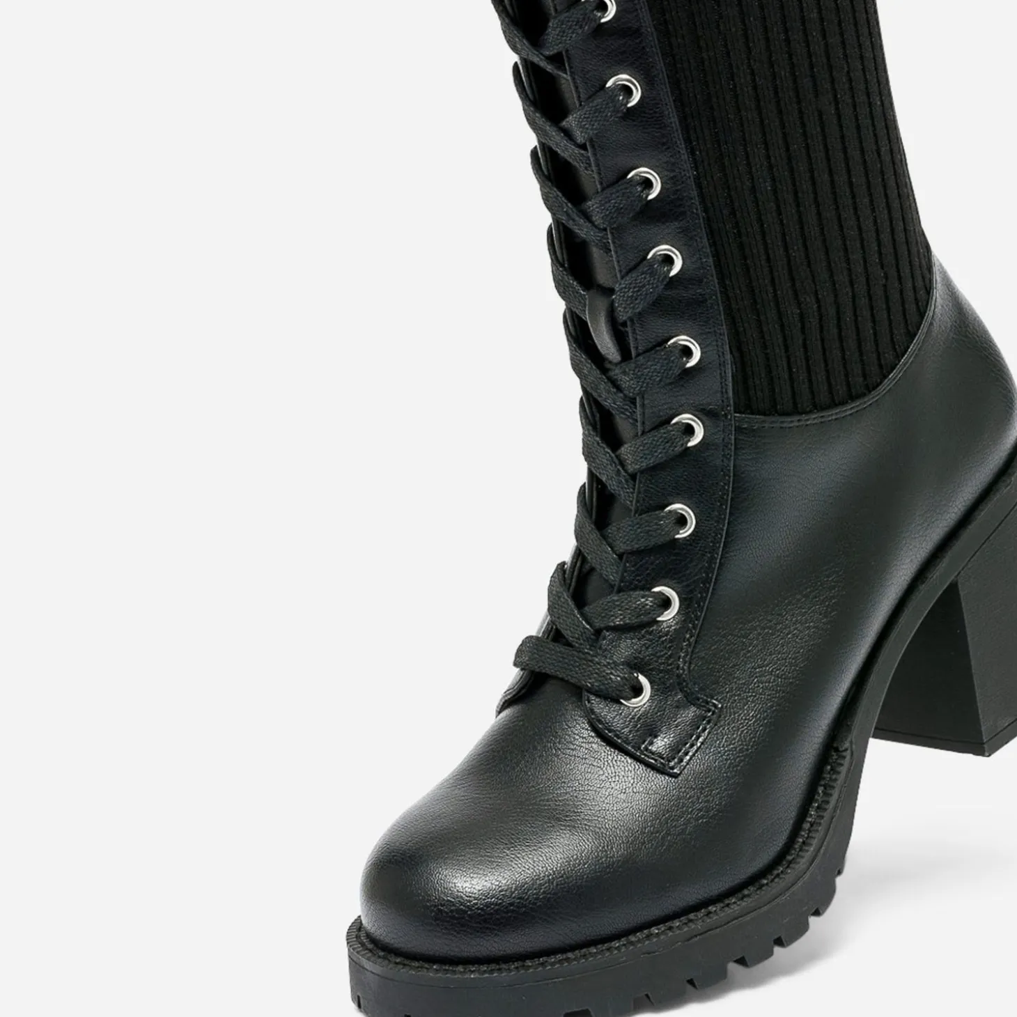 Et si vous bousculiez les modes ? Jouez avec la mode en chaussant cette botte pas tout à fait comme les autres. Elle doit son style rock voire grunge avec son mix de matières maîtrisé. Dessus synthétique et tige en textile côtelé, le tout en ton sur ton noir, fermée à la fis par un lacet et un zip intérieur. Un modèle qui épouse la jambe et mérite d’être exposé, sur des leggings ou des collants, avec pourquoi pas, un total look maille, ultra tendance.