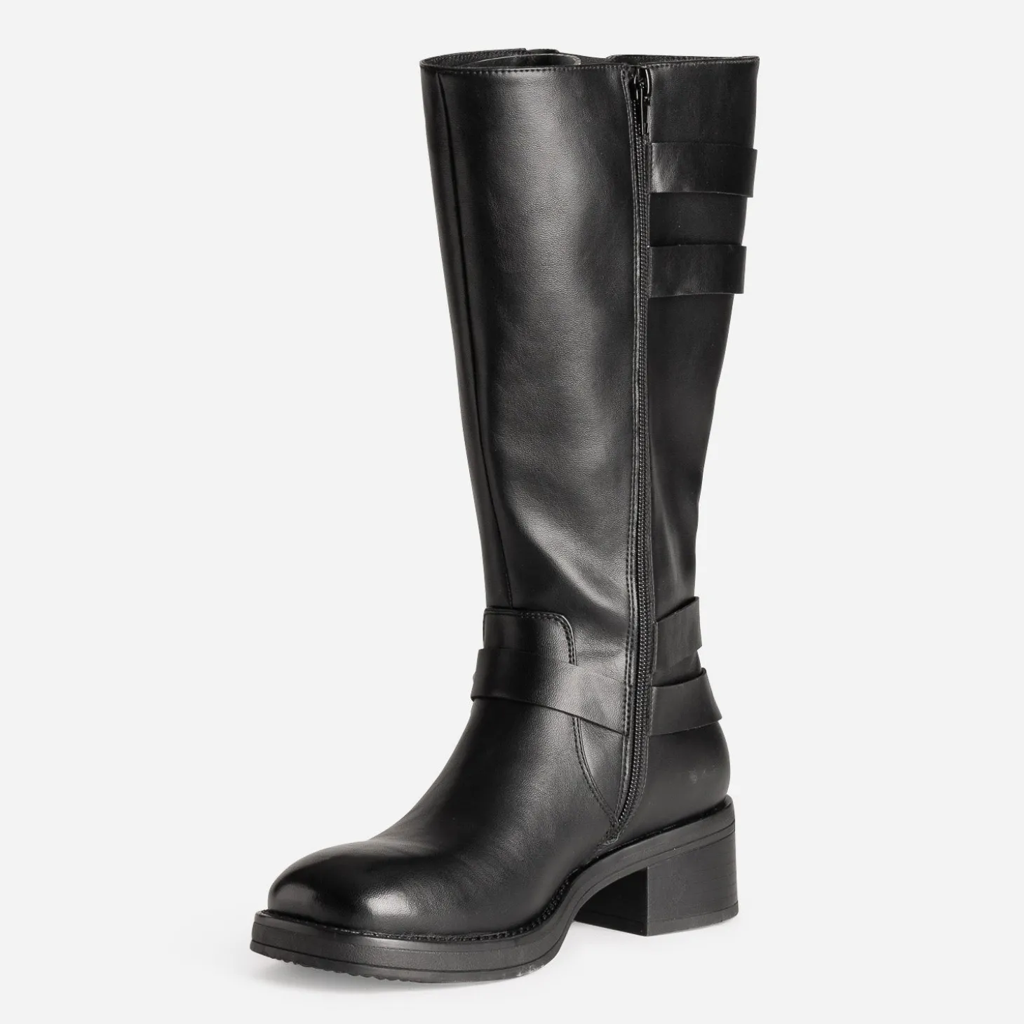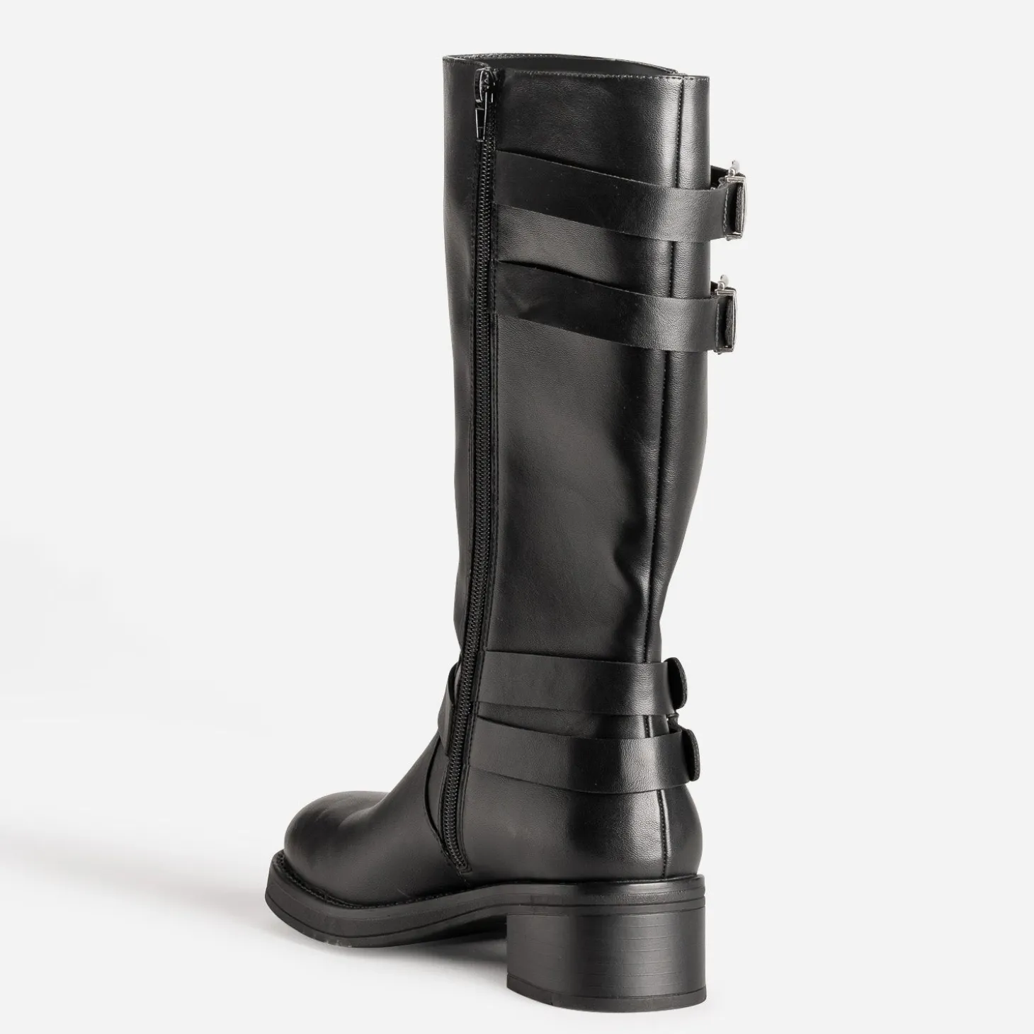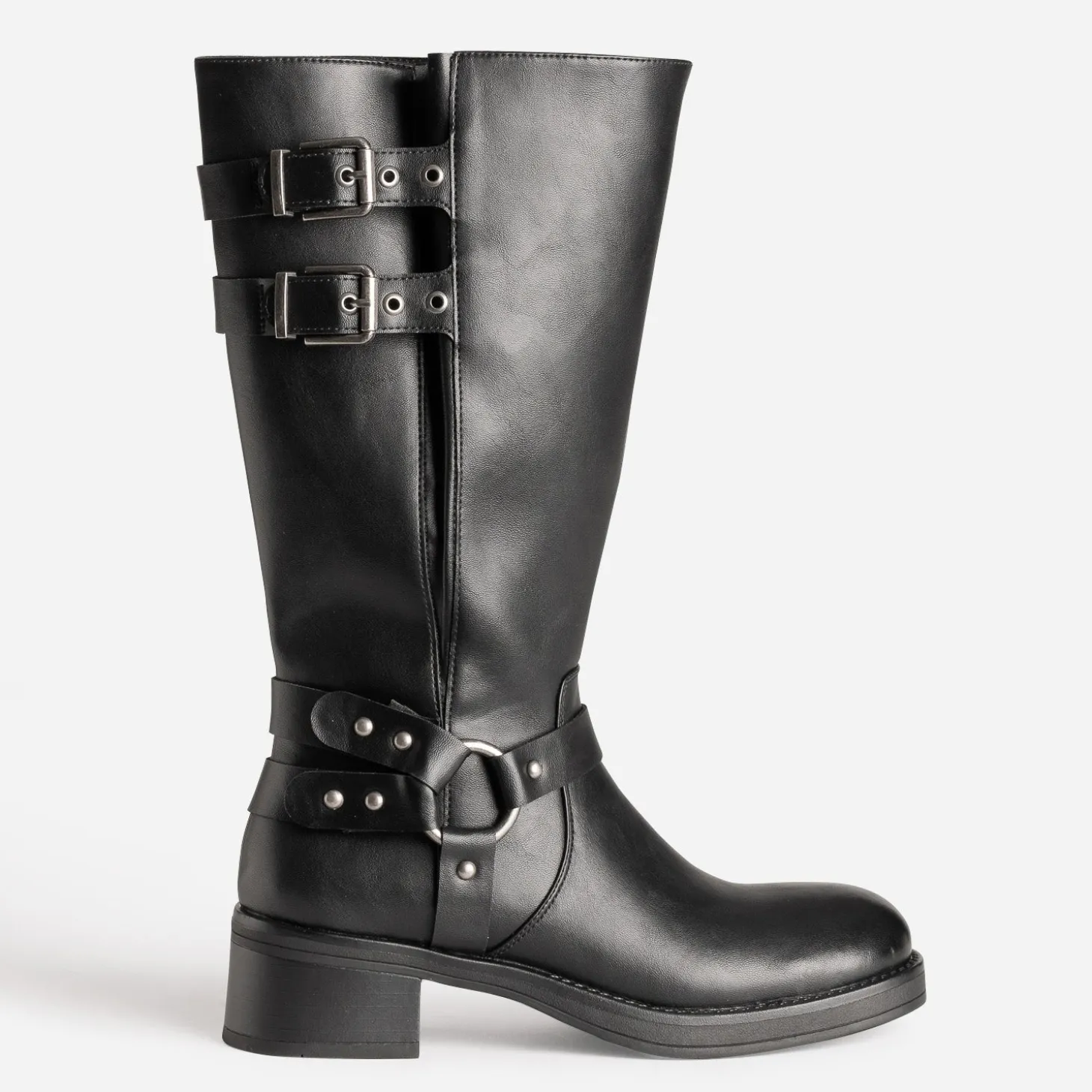 La tendance motard fait un retour remarqué. A vos pieds, la botte s’impose. En matière synthétique lisse noire, elle présente un bout carré, un talon large, très stable, et une tige avec soufflet, qui privilégie l’aisance du mollet. Bride en T avec anneau métal et décor clous, double bride ajustable par boucle, les détails se font signature d’un style qui n’a plus rien à prouver. Un modèle très mode, à préférer avec un pull à col roulé et une mini jupe en cuir, ou un slim glissé à l’intérieur.