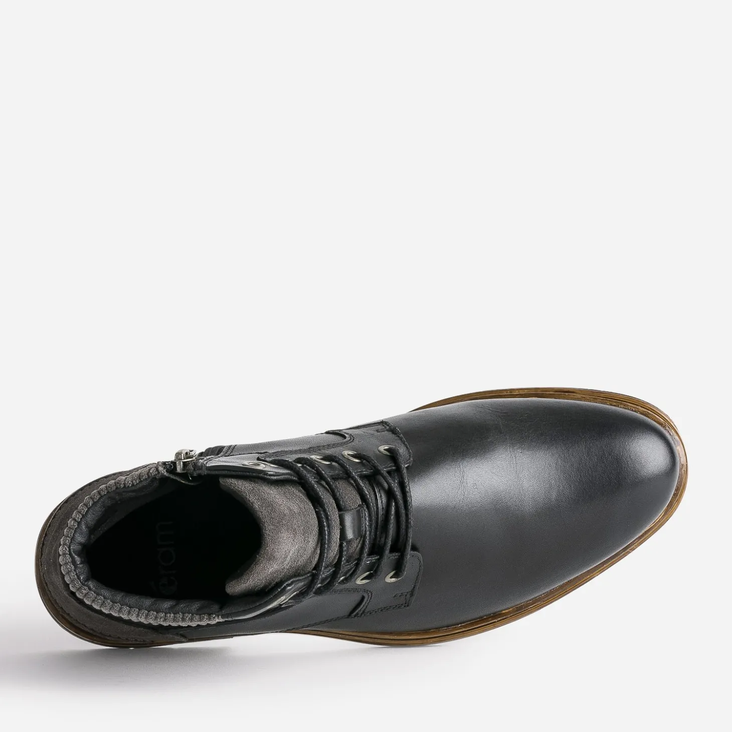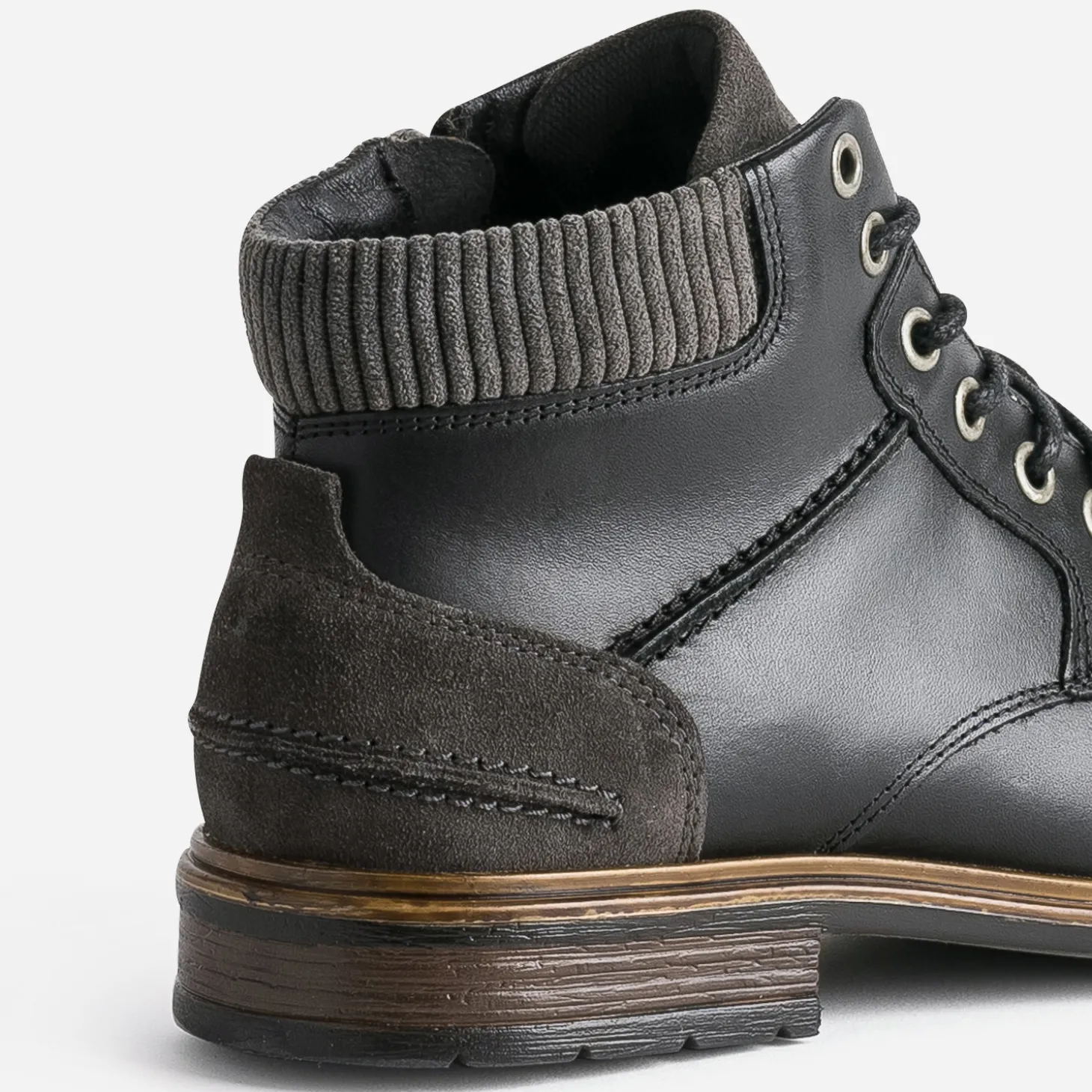 Cette bottine pour homme est un modèle idéal pour le quotidien. En cuir noir, elle est rehaussée d’empiècements en textile gris, sur le haut de la tige, le contrefort et la languette. La fermeture par lacet est renforcée par un zip intérieur, facilitant l’entrée et la sortie du pied. Pull camionneur gris, pantalon chino noir, elle s’adapte à un style casual, du lundi au dimanche.