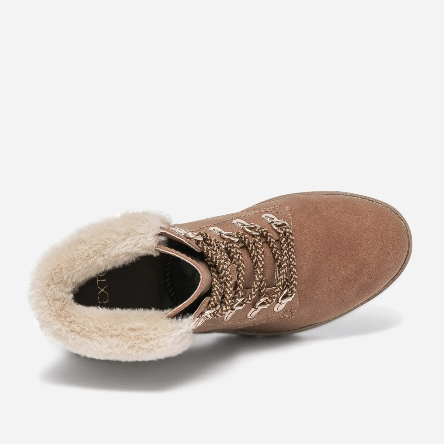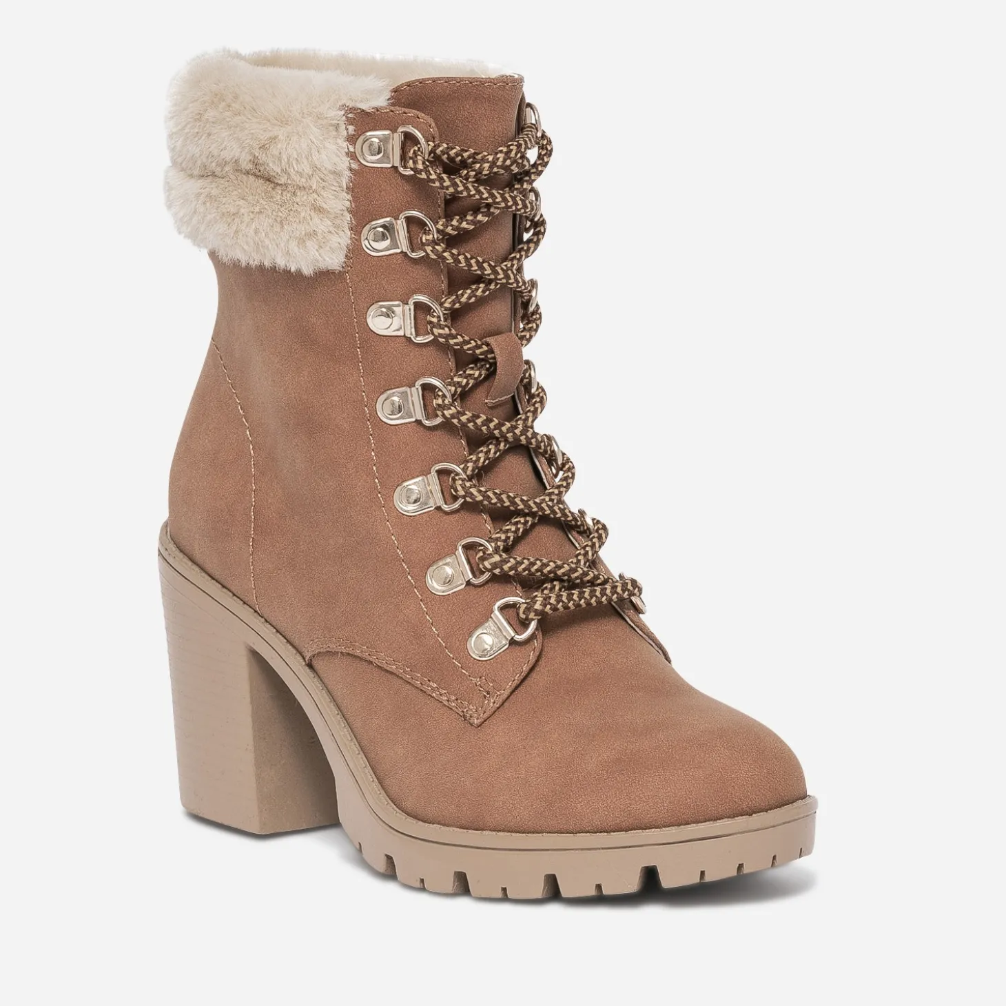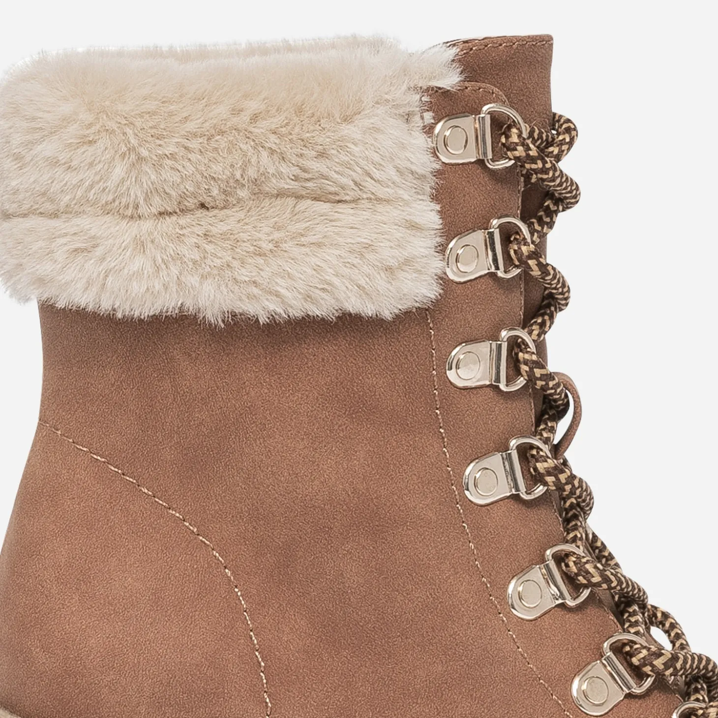 Semelle crantée, haut de tige avec empiècement fourré écru, laçage esprit cordon inspiré des chaussures de montagne, cette bottine pour femme bouscule les codes. Comment ? Par un talon carré de 8 cm d’une parfaite stabilité, par une matière synthétique suédée camel et des œillets dorés. Un modèle tout-terrain, parfait pour arpenter le bitume urbain, avec ou sans chutes de neige.