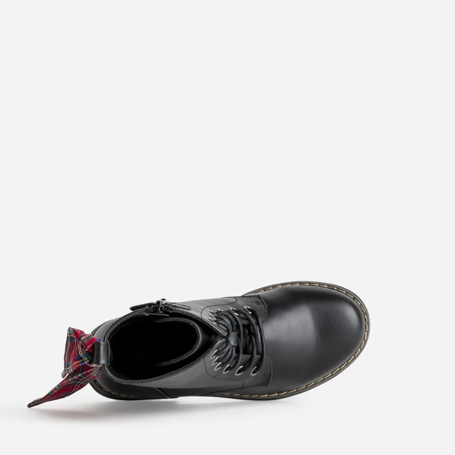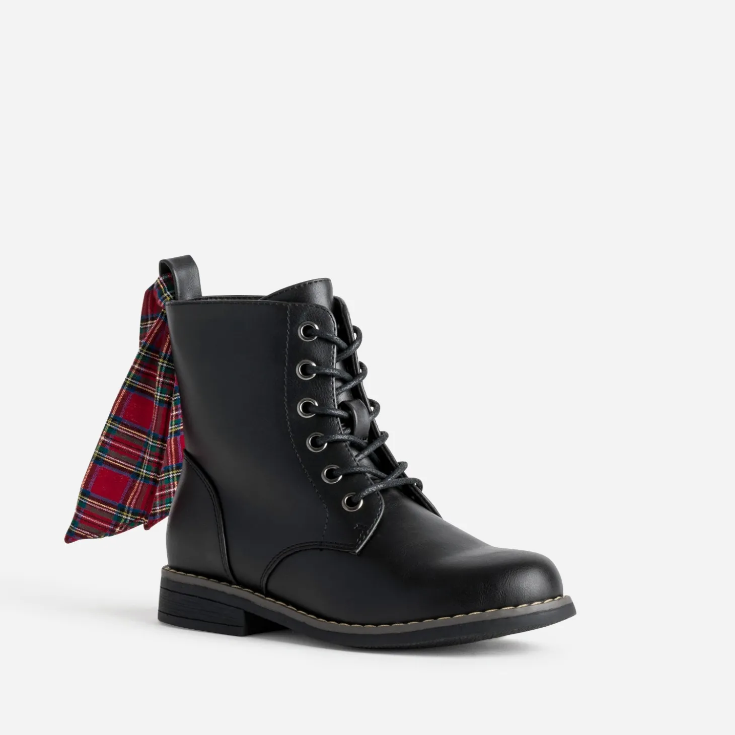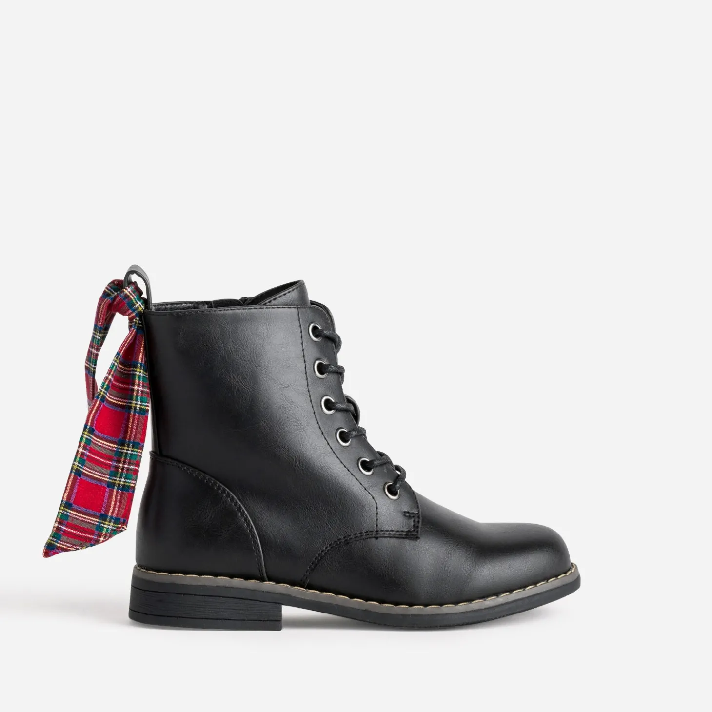 Celle que votre fille ne va pas quitter de si tôt, c’est la bottine. En cuir noir, elle monte au-dessus de la cheville et se ferme par un lacet, renforcé par un zip intérieur. Son détail qui change tout ? Des rubans amovibles, écru à motif léopard ou rouge à motif tartan, à nouer, ou pas, à l’arrière de la tige. Un modèle facile à associer avec ses looks de rentrée et de plein hiver.