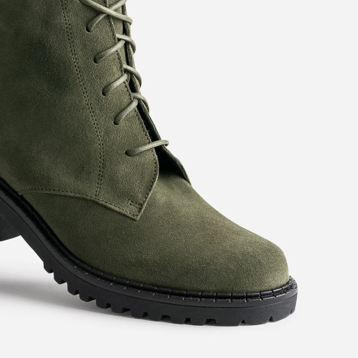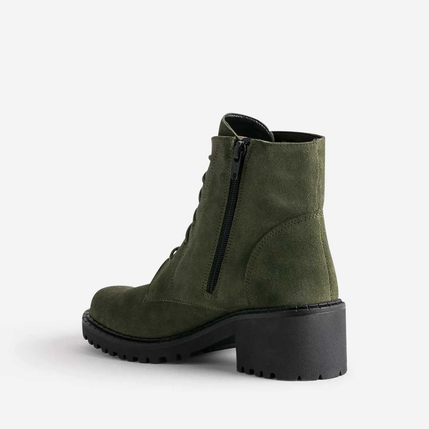 Cette bottine femme revisite la tendance militaire. Par un coloris kaki, indémodable. Par un cuir velours, souple. Par une semelle crantée, assurant une meilleure adhérence au sol. Associez-la avec une parka kaki matelassée, un pull à col roulé et un jean noir.