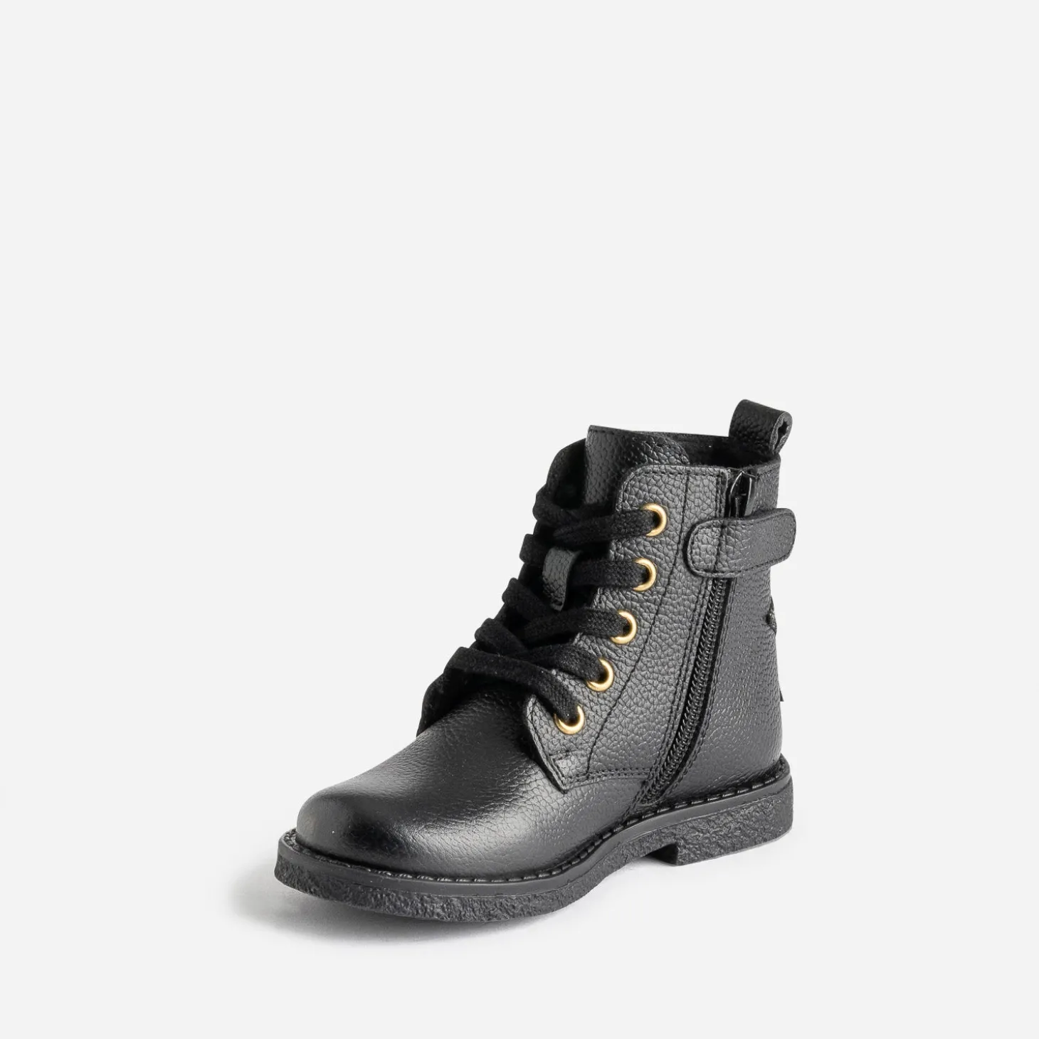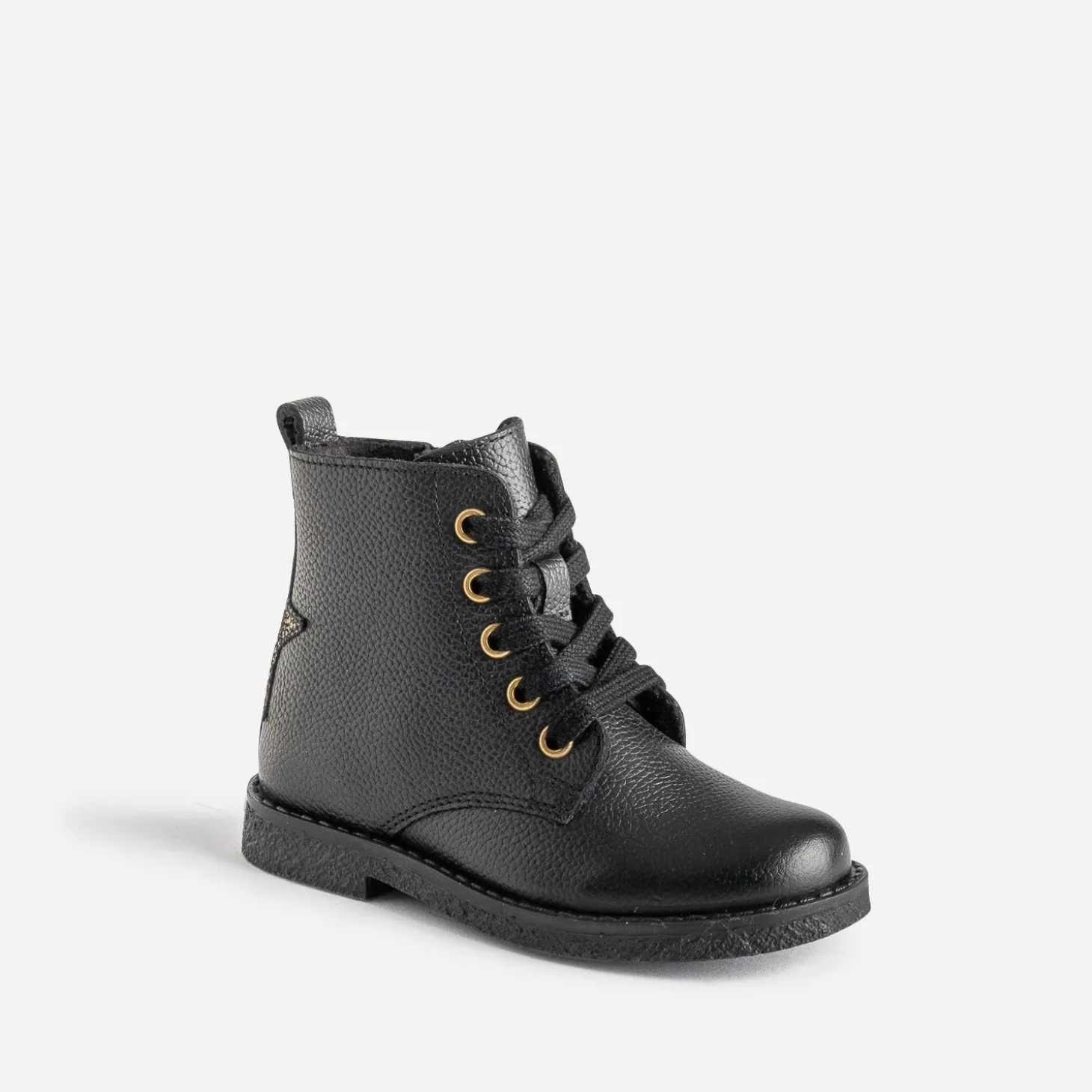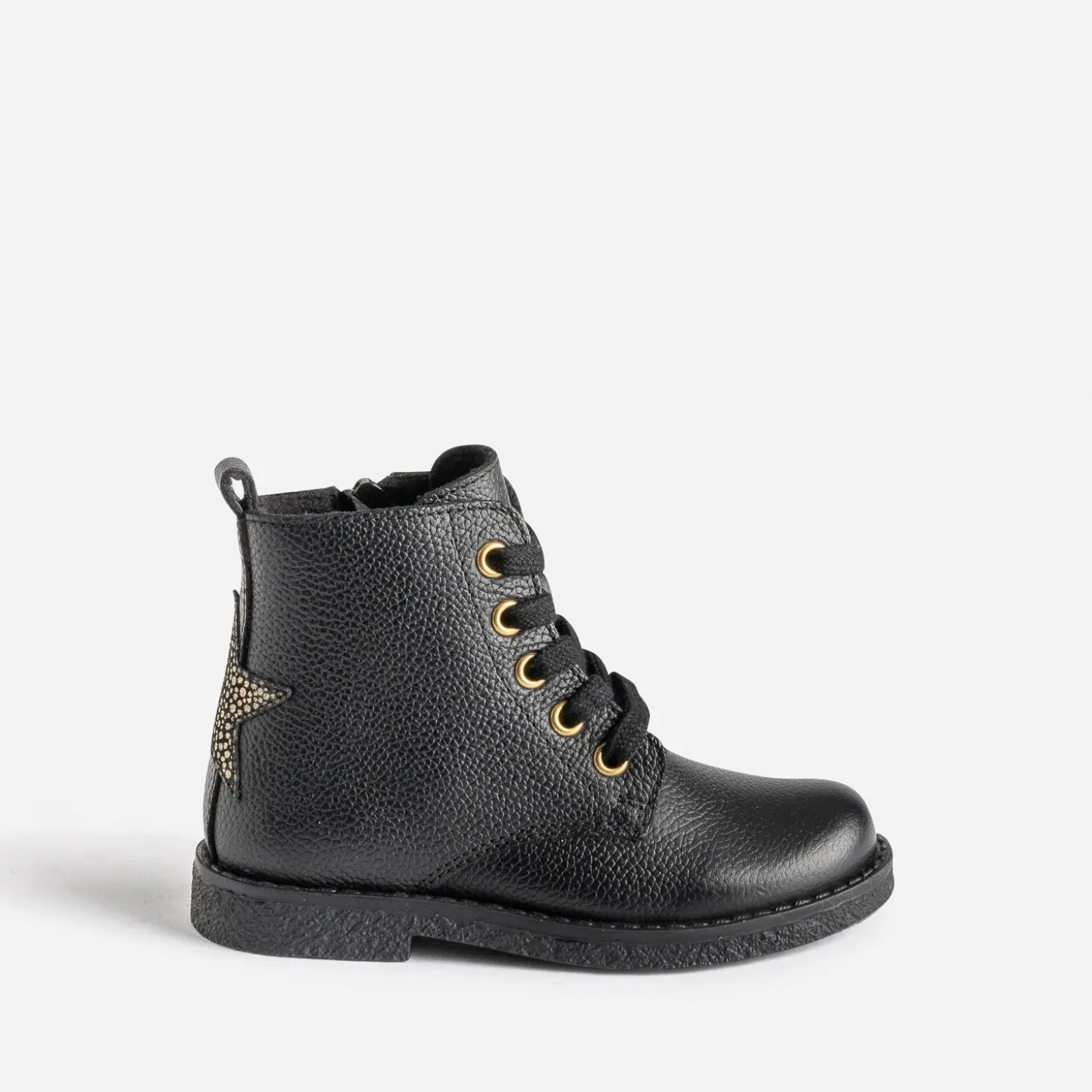 Confectionnée en cuir noir, cette bottine pour fille s’accorde aussi bien avec une robe en tulle noire qu’avec un pull et un jean slim. Un esprit rock renforcé par l’étoile dorée, posée sur le contrefort. Laçage, zip extérieur et scratch contribuent à maintenir le pied.