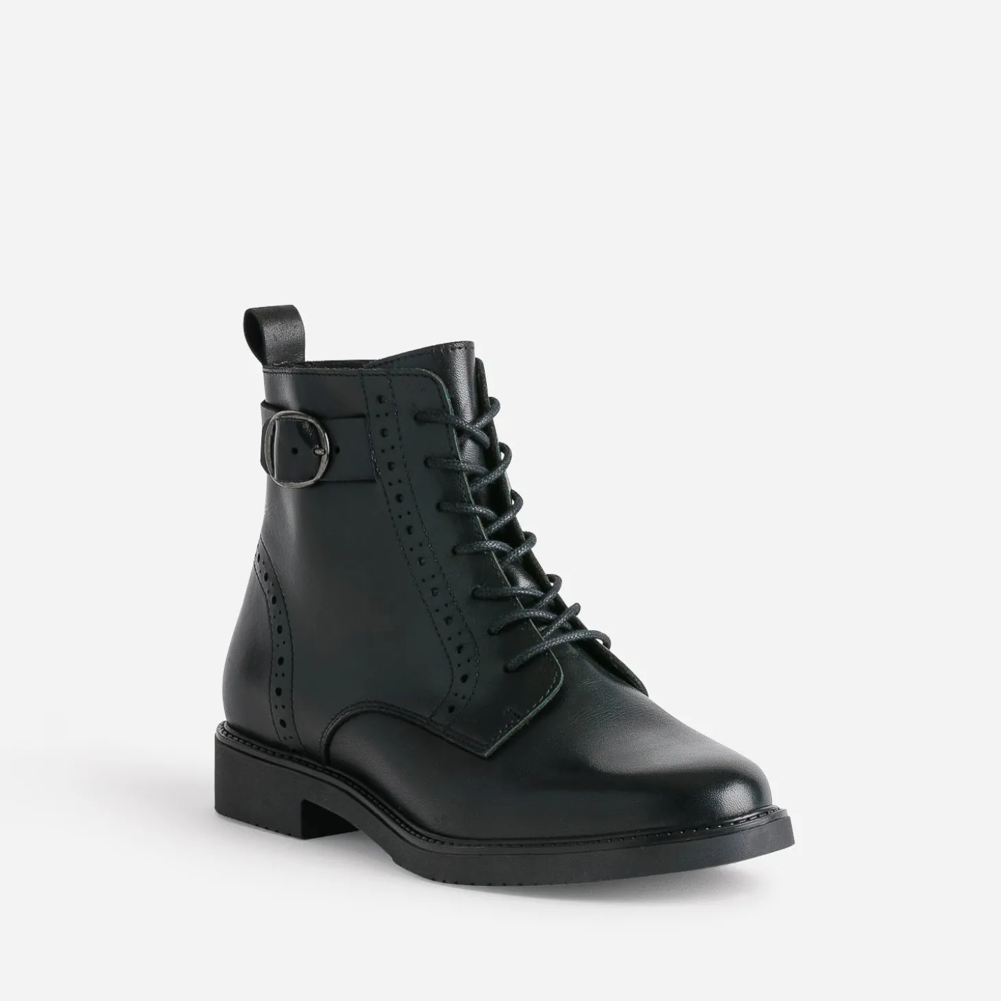 La saison est marquée par le retour du cuir en premier plan, à porter comme une seconde peau. La bottine n’y échappe pas ! En cuir lisse, elle opte pour un coloris noir, intemporel, et des détails de perforations sur la patte de laçage et le contrefort. Le zip intérieur facilite l’entrée et la sortie du pied. Un modèle à privilégier avec un blouson aviateur, un pull chaussettes, une jupe midi en cuir et des chaussettes hautes.