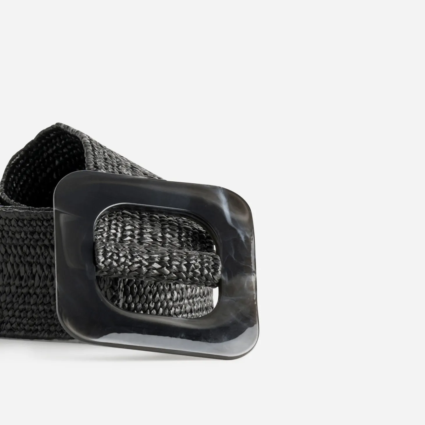 Une taille soulignée, et c’est toute la tenue qui gagne en élégance ! La ceinture prend ses quartiers d’été, dans une matière tressée noire, avec une boucle carrée en résine façon marbre. Un modèle adaptable à toutes les morphologies, sur une robe longue, vaporeuse et asymétrique, avec des mules plates.