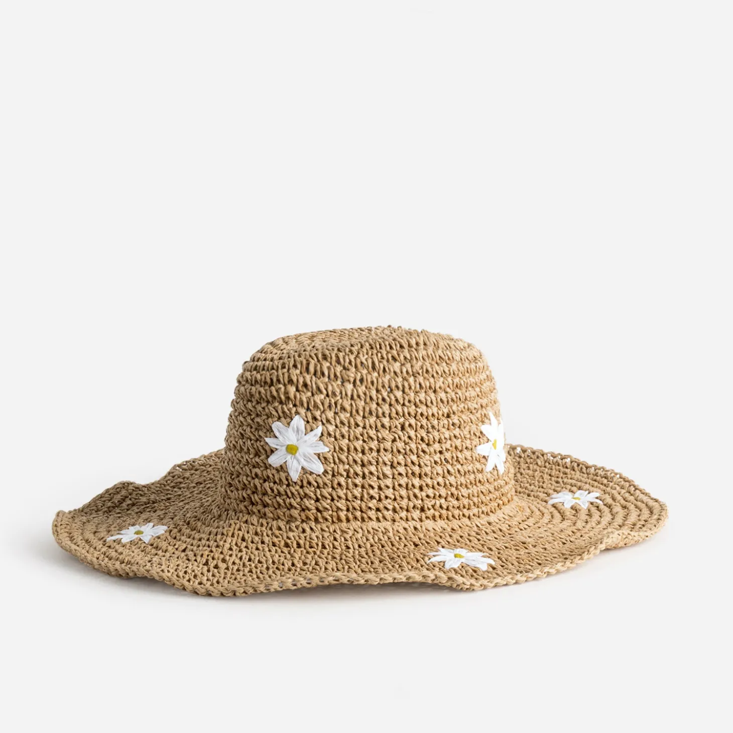 Inspiration marguerites pour les fleurs blanches de ce grand chapeau pour femme. Brodées sur paille papier beige foncé, elles annoncent l’arrivée imminente du printemps, du soleil, de la chaleur. Un accessoire à la fois fonctionnel et stylé, très à l’aise avec un débardeur blanc, un short en jean bleu et des mules camel en cuir velours.