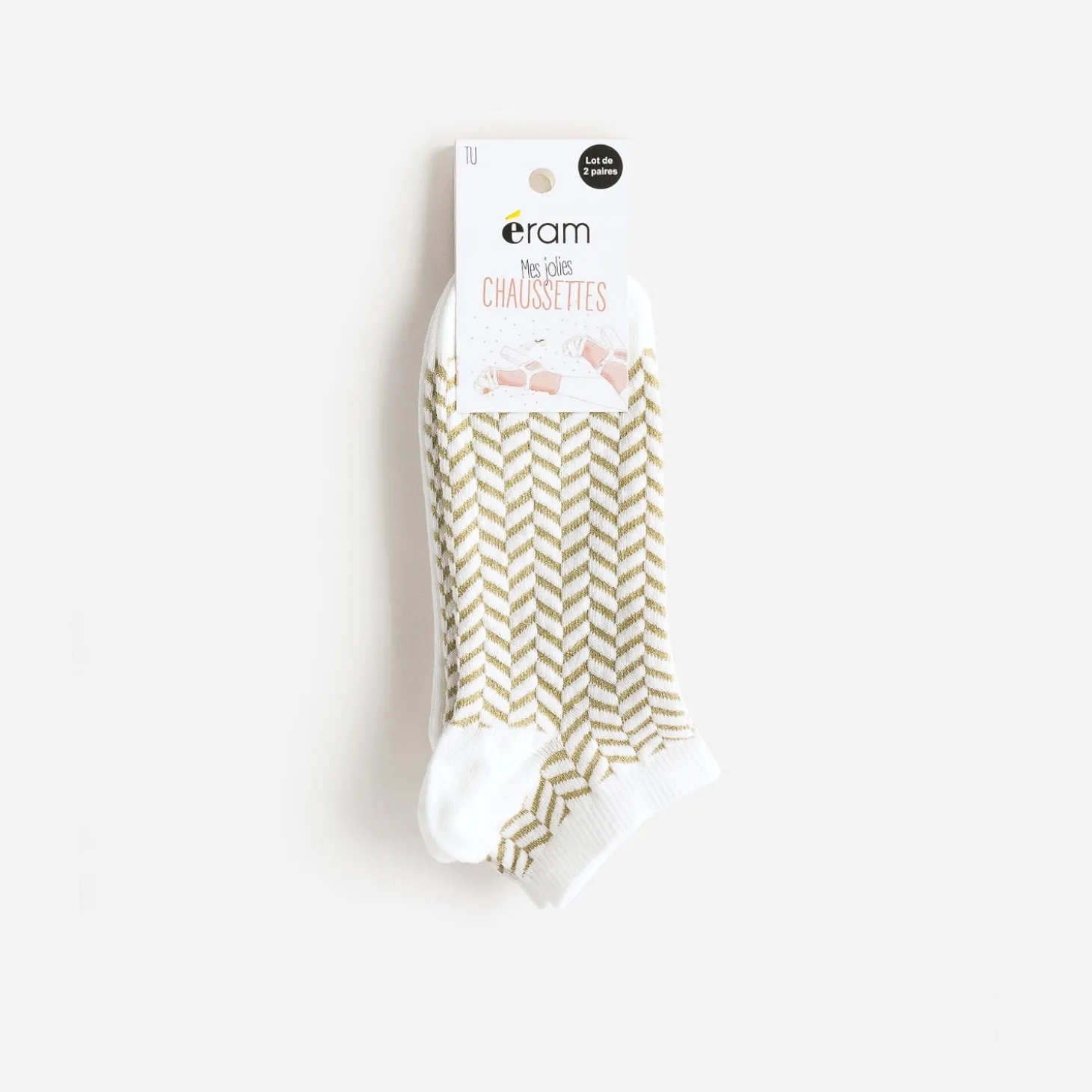 Couleur écrue, ces deux paires de chaussettes sont idéales au quotidien, avec des sneakers basses ou des derbies. Version unie ou rythmée de mini-chevrons dorés, elles finalisent le look d’une touche casual chic.