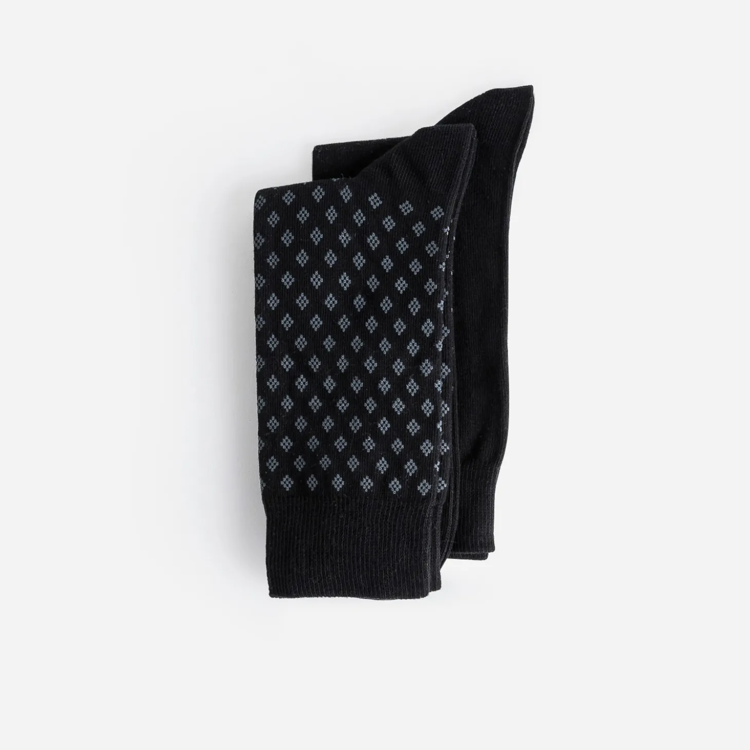 Des chaussettes noires unies. Des chaussettes noires jacquard à motif cravate. Des chaussettes pour homme, idéales, au quotidien, avec un costume noir ou gris foncé, ou avec un look plus casual.