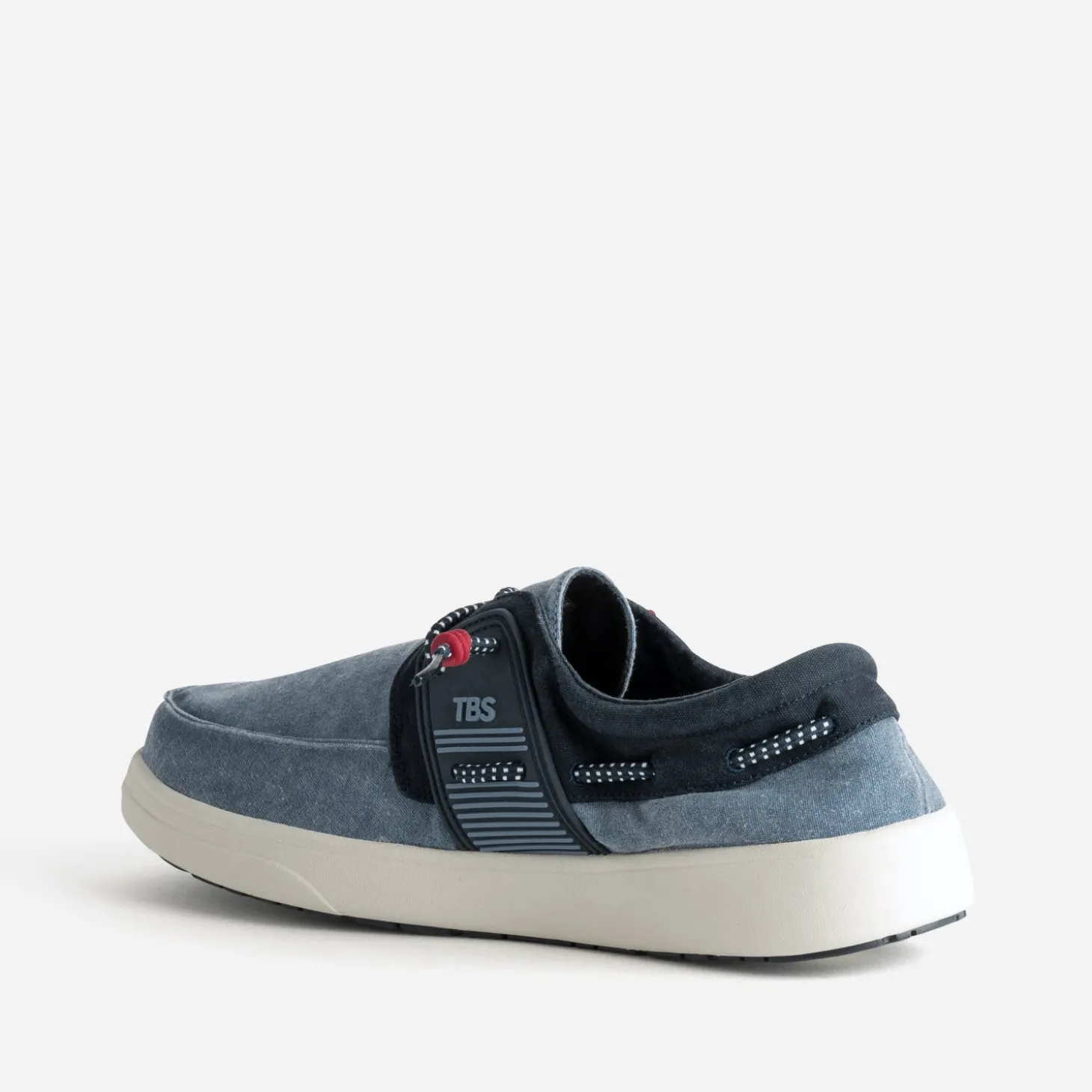 Initialement conçue pour la navigation et la voile, la chaussure-bateau sort de sa zone de confort. Revisitée par une toile bleu ciel, elle présente des quartiers bleu marine, et un lacet façon cordon élastiqué avec stoppeurs. Souple et légère, elle présente une semelle intérieure amovible, pour y glisser une semelle plus adaptée. Un modèle très estival, à réserver aux week-ends et aux vacances, avec un tee-shirt blanc et un bermuda battle bleu.