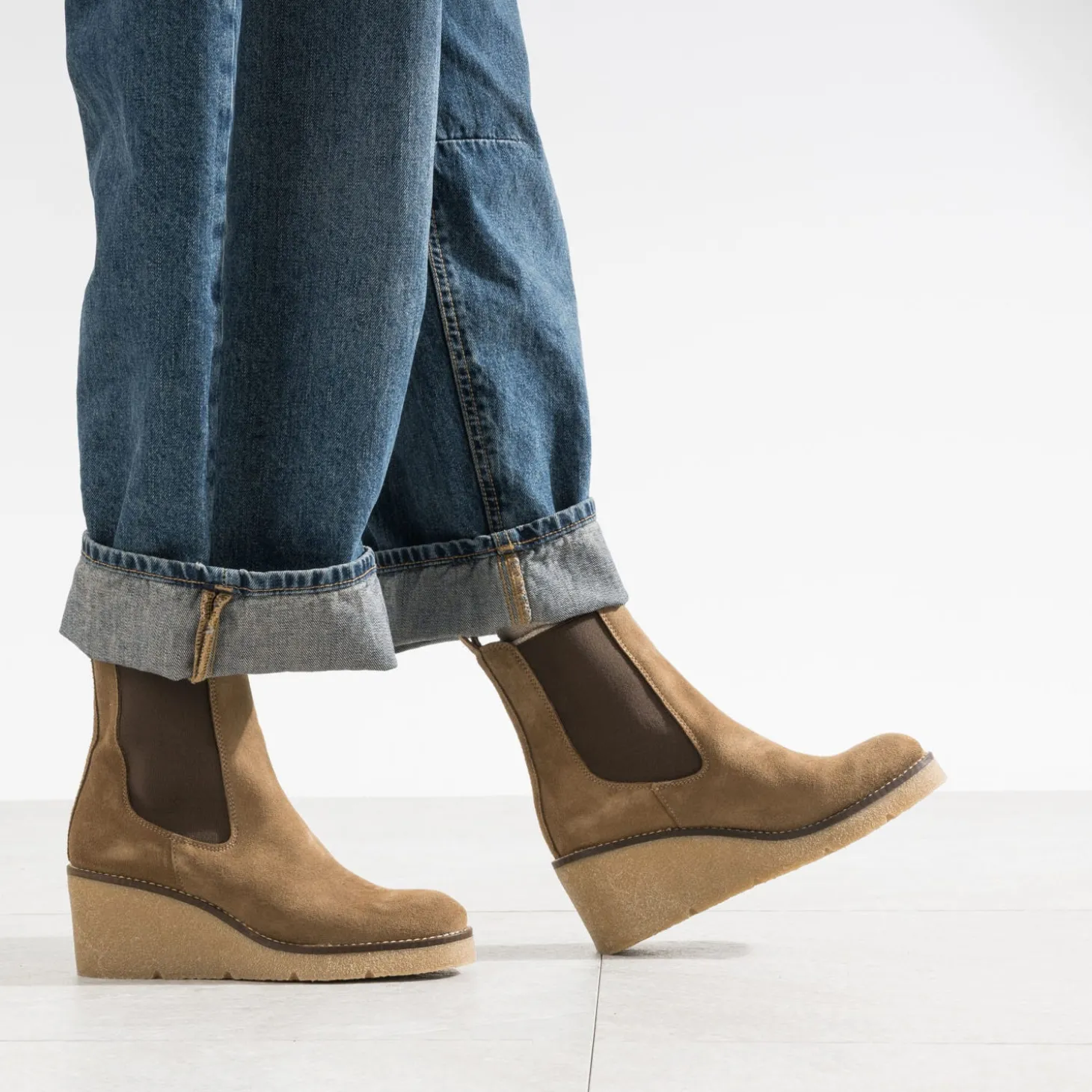 Must-have annoncé pour ce boots femme. Pour son cuir velours, son coloris beige taupé et sa semelle compensée imitation crêpe et crantée. Il surprend par son incroyable confort au porté, grâce à une plateforme d’1,5 cm à l’avant et un talon de 6,5 cm à l’arrière. Un modèle à essayer sans attendre, avec une robe longue beige chiné en tricot à côtes plates ou une cape marron, sur un jean écru.