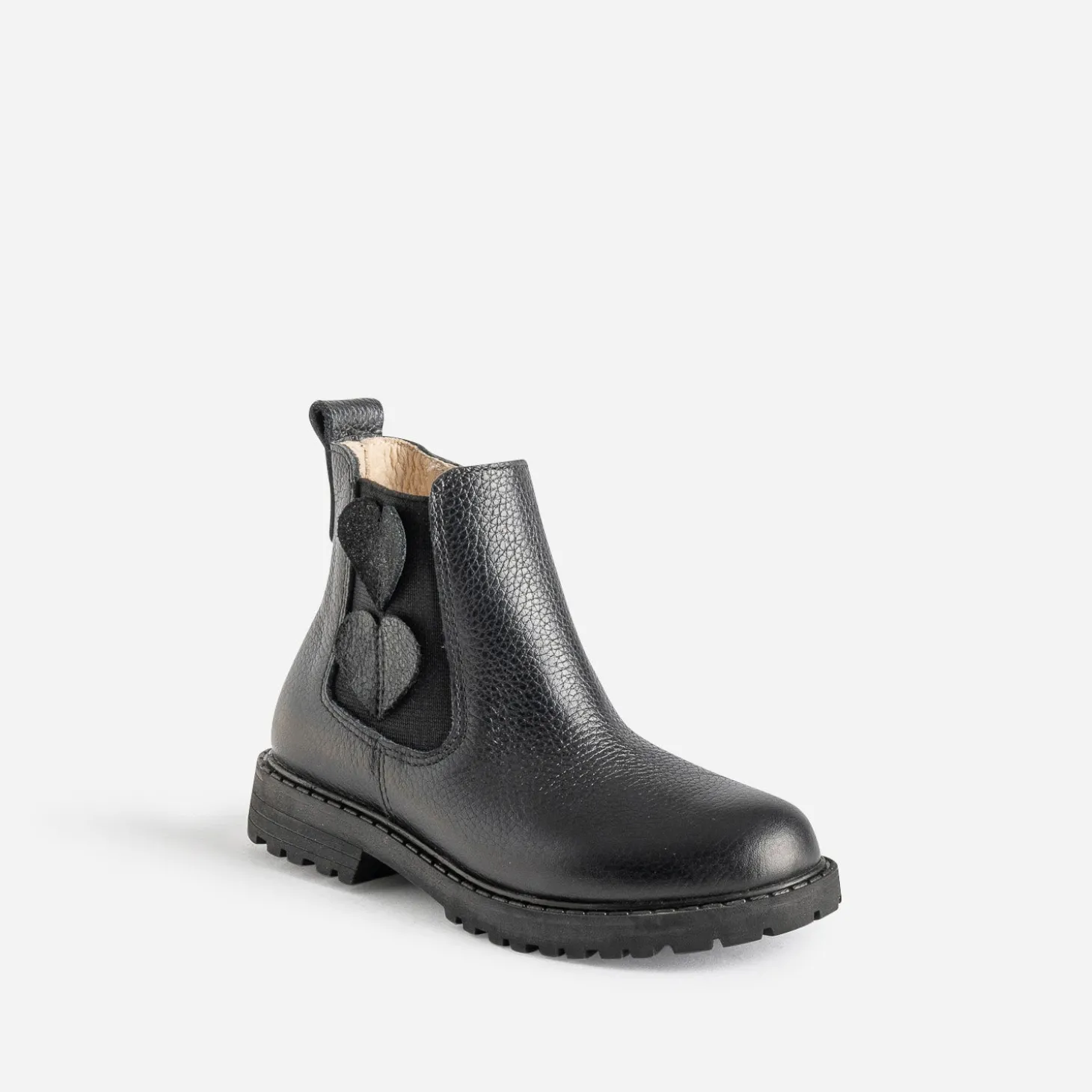 L’amour fou pour ce Chelsea boots fille. En cuir grainé noir, il se démarque par un décor de deux cœurs posés sur l’élastique latéral et une semelle crantée. Robe imprimée ou unie, short d’hiver ou jean slim, le look rock est vivement recommandé.