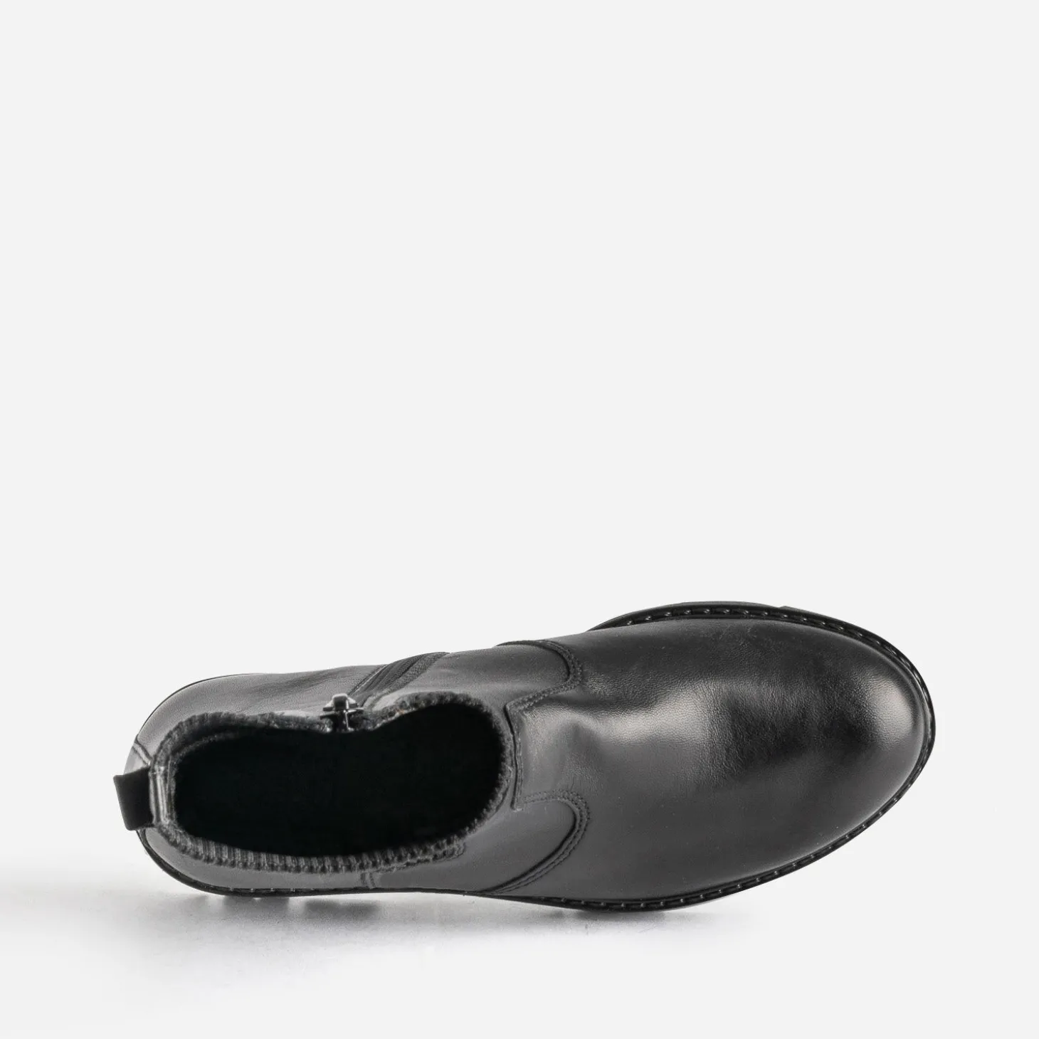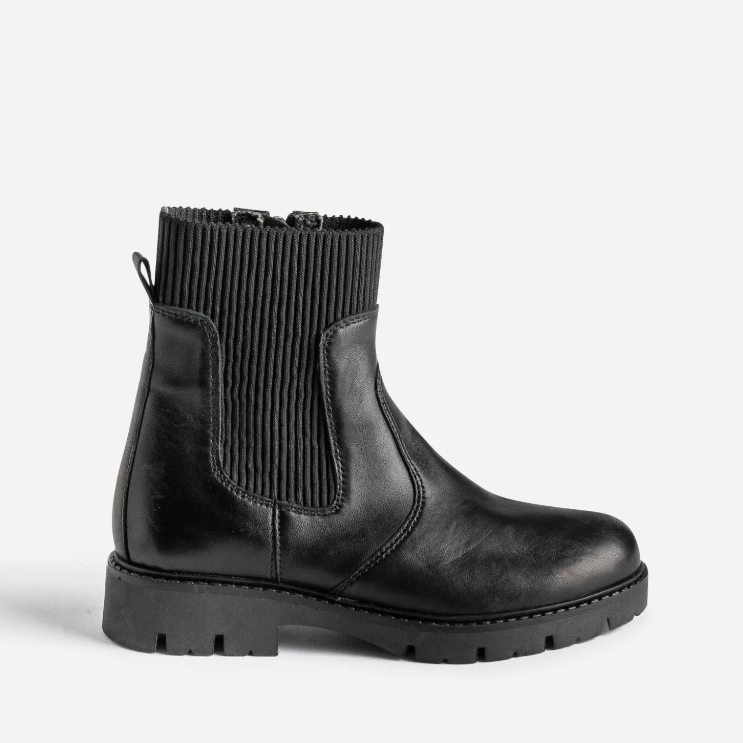 Rock attitude recommandée avec ce Chelsea boots pour fille. Noir, il se démarque par une tige en cuir lisse, prolongée par des élastiques en textile côtelé, et une semelle crantée. Robe plissée ou blouson esprit motard sur jean slim, misez sur un total look dark.