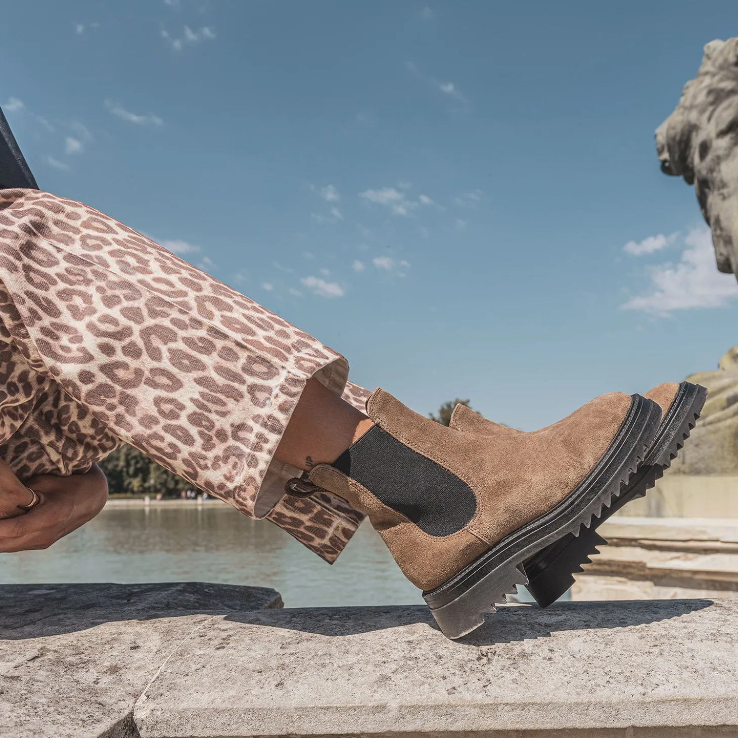 Laissez-vous inspirer par le dynamisme de la capitale anglaise ! En cuir velours beige foncé, ce Chelsea boots bouscule sa ligne classique par une semelle noire, épaisse et crantée et par une tige haute, avec des longs élastiques latéraux. Un modèle à oser avec une longue robe en maille dans les tons naturels et chinés et un perfecto en cuir.