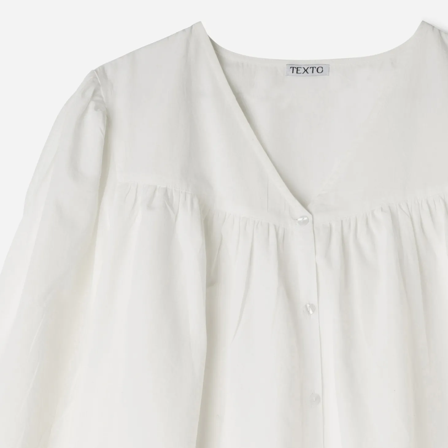 Forme droite, encolure V, manches longues boutonnées, petites fronces aux épaules, devant et manches, découpe poitrine, fermeture par boutons.