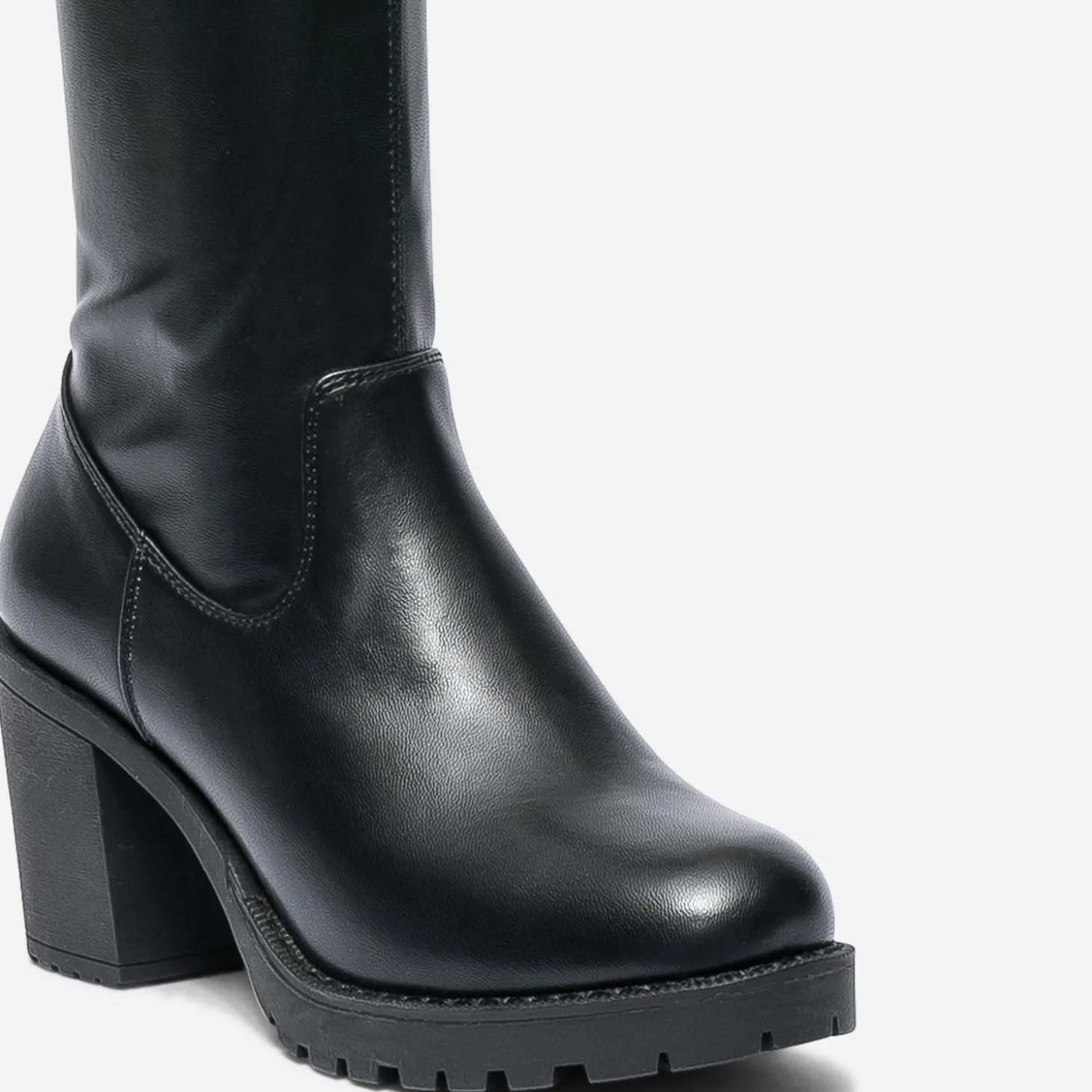 Esprit tout-terrain pour cette cuissarde femme. Montée sur une semelle et un talon large crantés, elle est pensée pour fouler le bitume urbain. Noire, elle est confectionnée en matière synthétique noire, fermée par un zip intérieur qui facilite l’entrée et la sortie du pied et maintient la tige sur le mollet. Un modèle à tester avec un look d’inspiration grunge, sur un leggings en simili et une sur-chemise à carreaux.