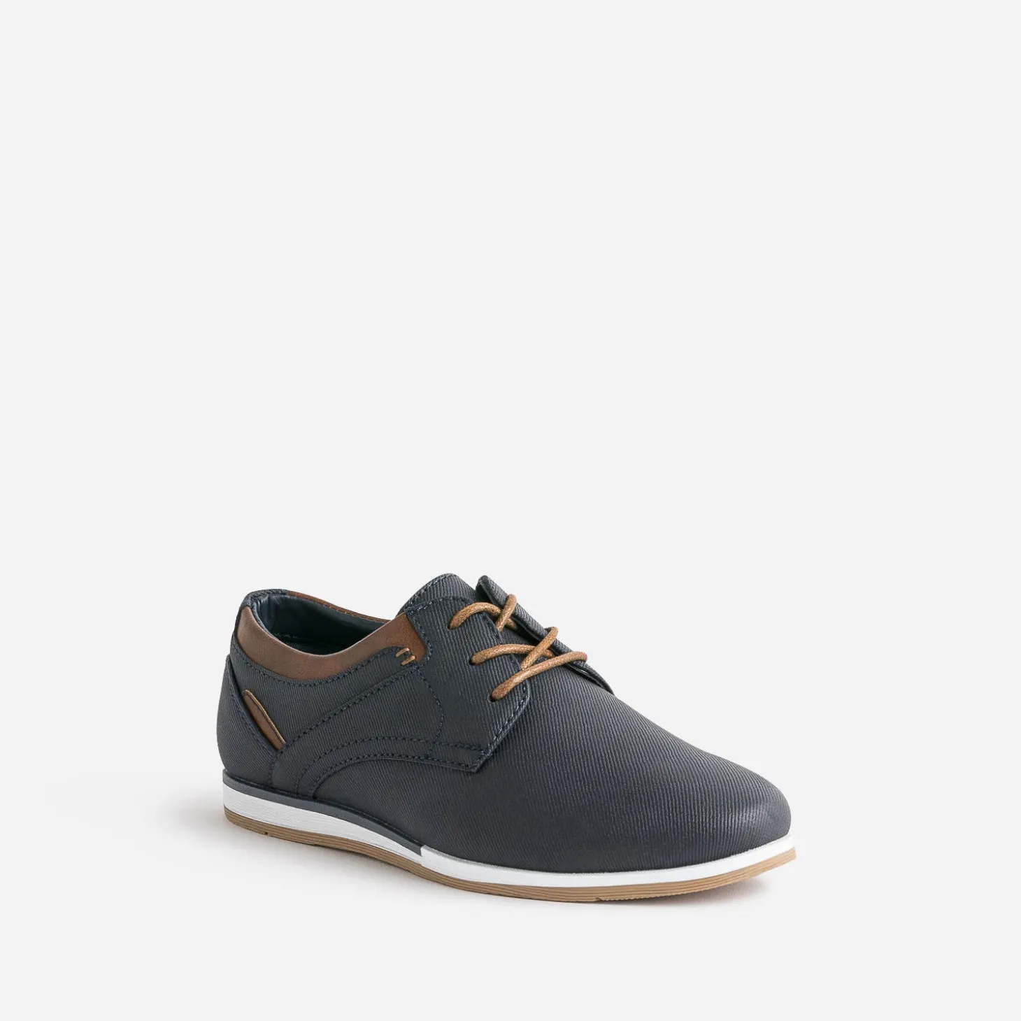 Matière synthétique rainurée, doublure textile chinée, détails marron, ce derby pour garçon s’invite dans le dressing d’été. Il séduit par une semelle tricolore légèrement compensée, pour plus de confort, et un style plus décontracté.