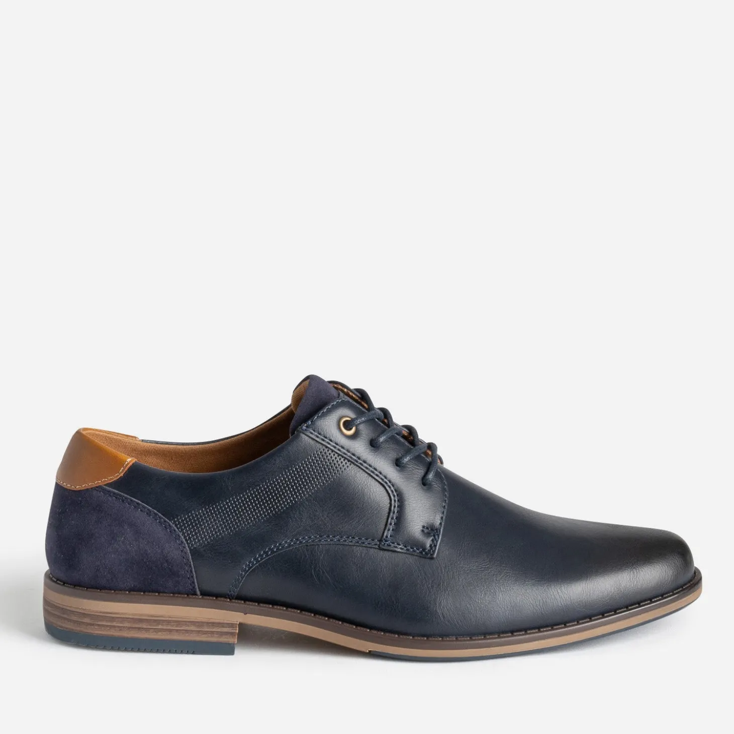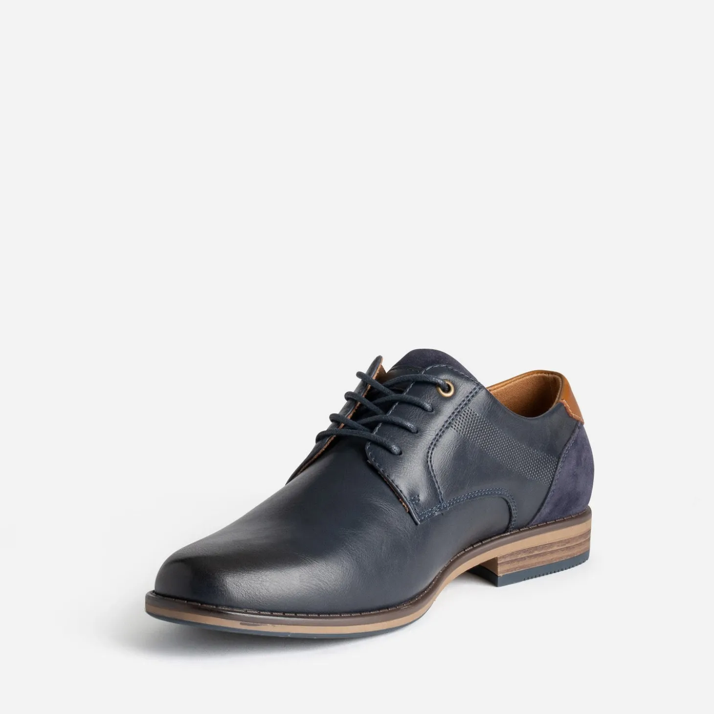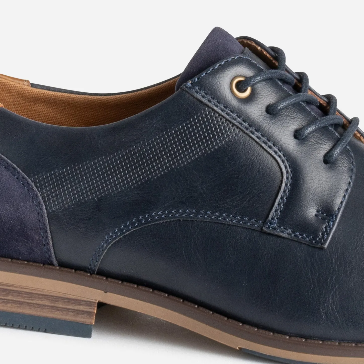 Matière synthétique lisse de belle qualité pour ce derby homme. Bleu marine, il se laisse twisté de détails camel, sur le contrefort et la doublure, et marron, sur la semelle. Une bande décore les côtés, par un embossage perforé. Il se ferme par un lacet rond et ciré ton sur ton. Un modèle idéal avec une chemise blanche ou bleu ciel et un pantalon chino beige.