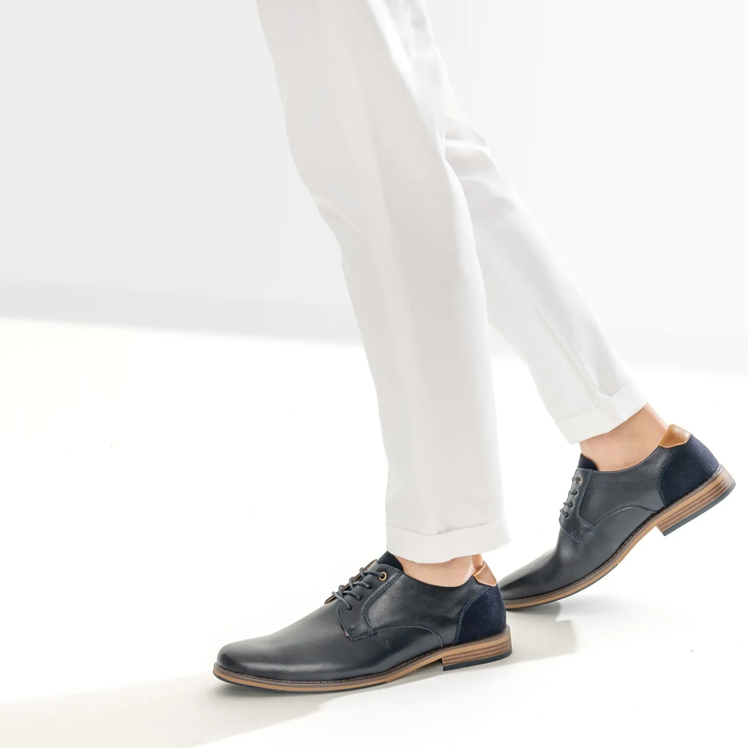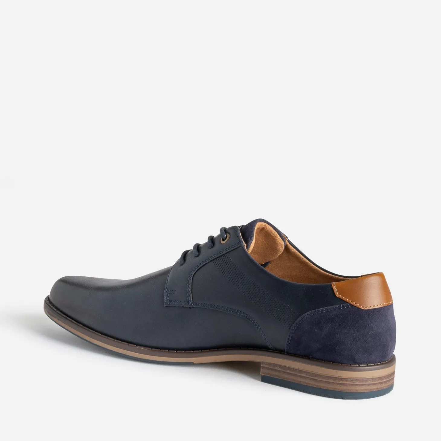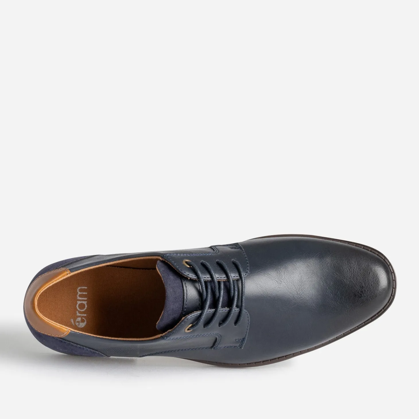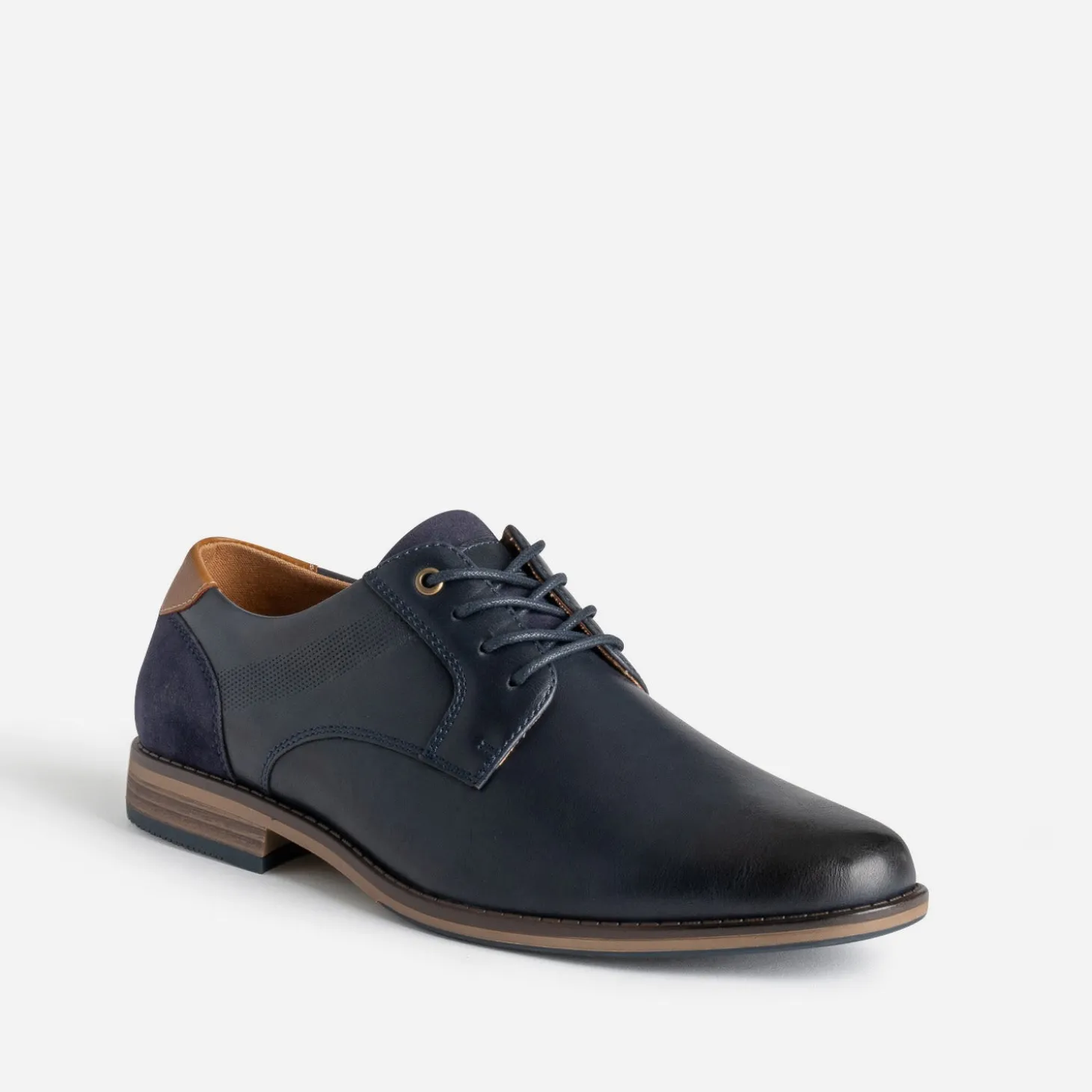 Matière synthétique lisse de belle qualité pour ce derby homme. Bleu marine, il se laisse twisté de détails camel, sur le contrefort et la doublure, et marron, sur la semelle. Une bande décore les côtés, par un embossage perforé. Il se ferme par un lacet rond et ciré ton sur ton. Un modèle idéal avec une chemise blanche ou bleu ciel et un pantalon chino beige.