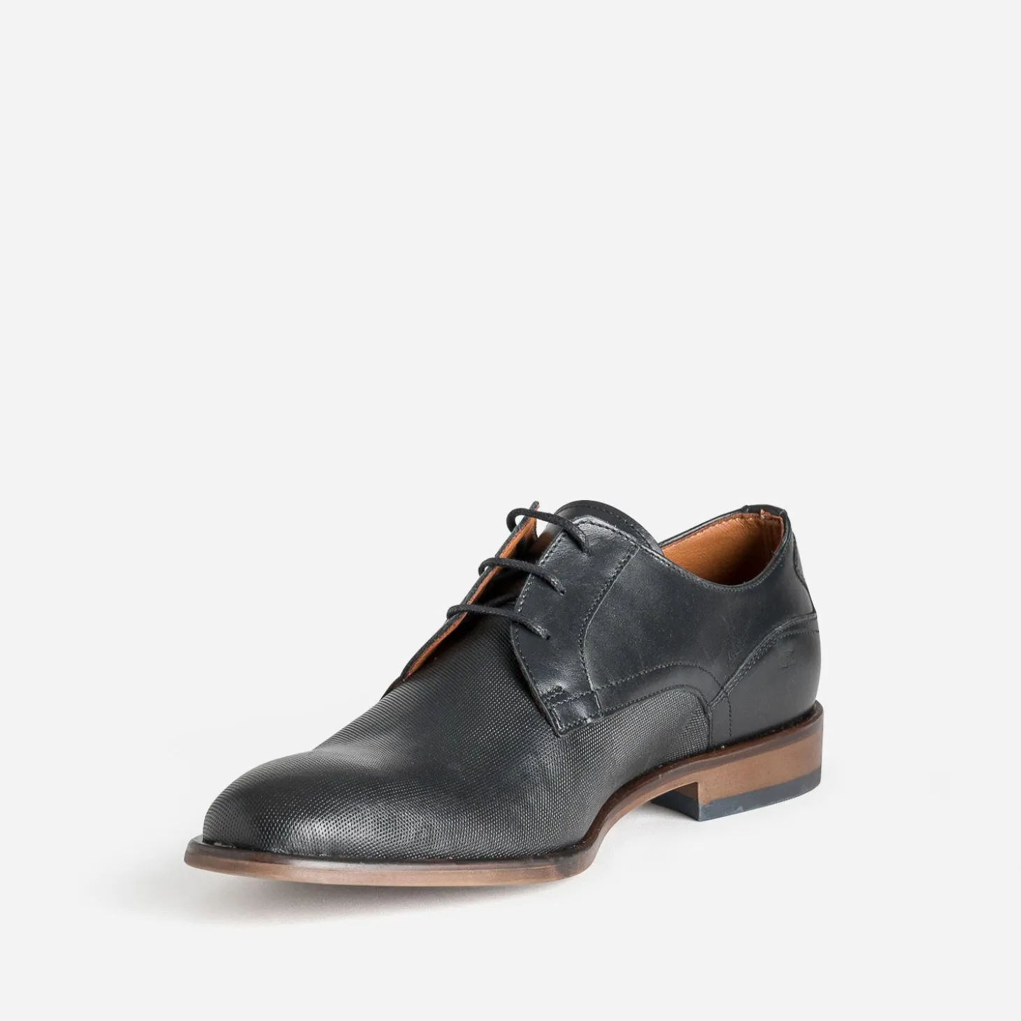 Le derby confirme son statut de soulier masculin, réservé aux tenues formelles. Confectionné en cuir, décliné en coloris noir, il se démarque par un effet embossé sur tout le dessus du pied, en contraste avec les quartiers, plus lisses. Il se ferme par un lacet rond, ton sur ton. Un modèle de référence, pour vos costumes noirs.