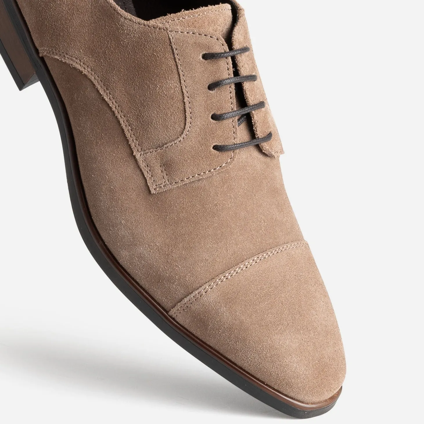 Laissez-vous convaincre par la subtilité du coloris taupe, mélange audacieux de beige et de gris. Il sublime le cuir velours de ce derby pour homme, finalisé par un bout droit. Un modèle à conjuguer, avec un costume bleu marine ou marron, ou plus fun, à décaler avec une chemise blanche, un pantalon chino beige avec bas roulottés et des chaussettes fuchsia.